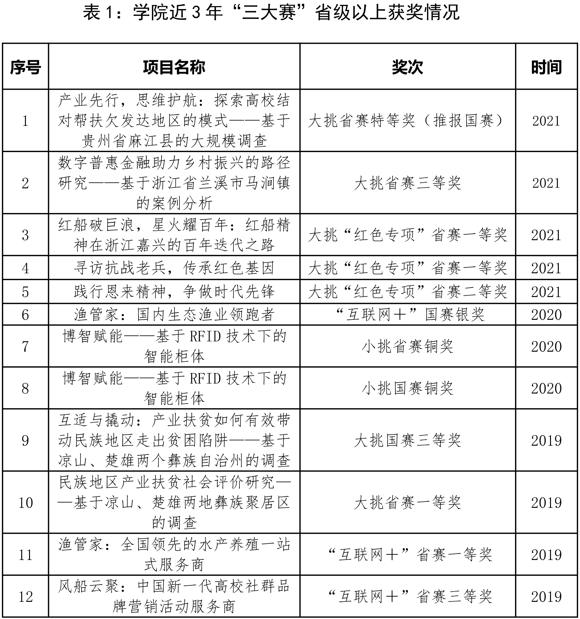 近年来,学院高度重视创新创业教育,积极组织师生参与“挑战杯”等国内外高水平竞赛,2019年至今累计获得“三大赛”省赛以上奖项12次。2021年,1项作品获“挑战杯”省赛特等奖,1项作品获“挑战杯”省赛三等奖,2项作品获“挑战杯”省赛红色专项一等奖,1项作品获“挑战杯”省赛红色专项二等奖。