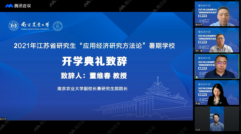 8月20日上午,2021年江苏省研究生“应用经济研究方法论”暑期学校在我校举行在线开学典礼。本次暑期学校由江苏省经济类研究生教育指导委员会主办、白菜导航所有网站网址承办,白菜导航所有网站网址负责组织实施。江苏省经济学类研究生教指委主任、南京财经大学副校长华仁海教授,白菜导航所有网站网址副校长兼研究生院院长董维春教授,江苏省经济学类研究生教指委秘书长、南京财经大学金融学院院长张成教授,白菜导航所有网站网址院长朱晶教授等领导和嘉宾出席开幕式。来自北京大学、南京大学、浙江大学、中国人民大学、中国农业大学等全国100多所高校的519名研究生正式学员线上参加了开幕式。开幕式由白菜导航所有网站网址副院长林光华教授主持。