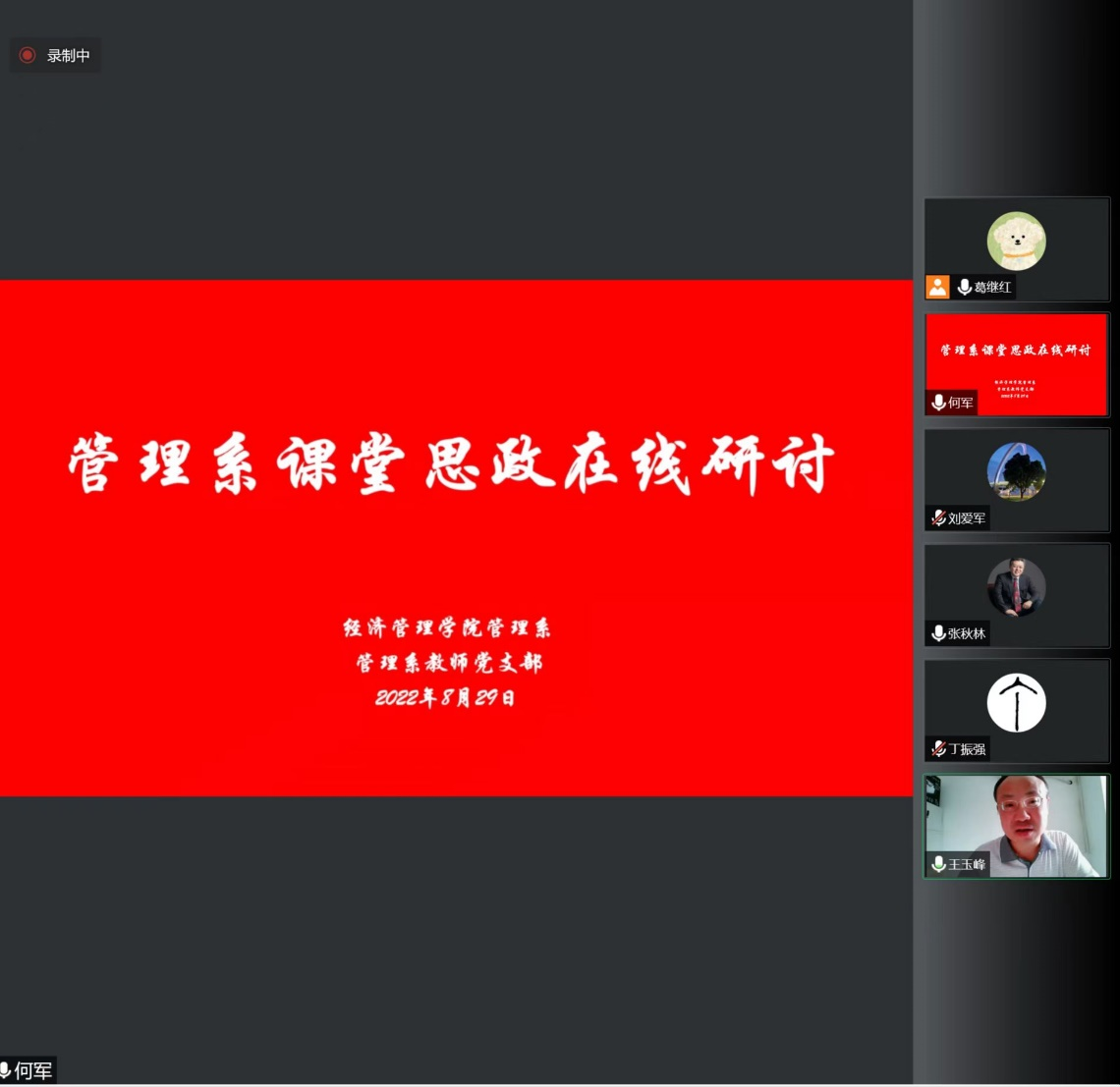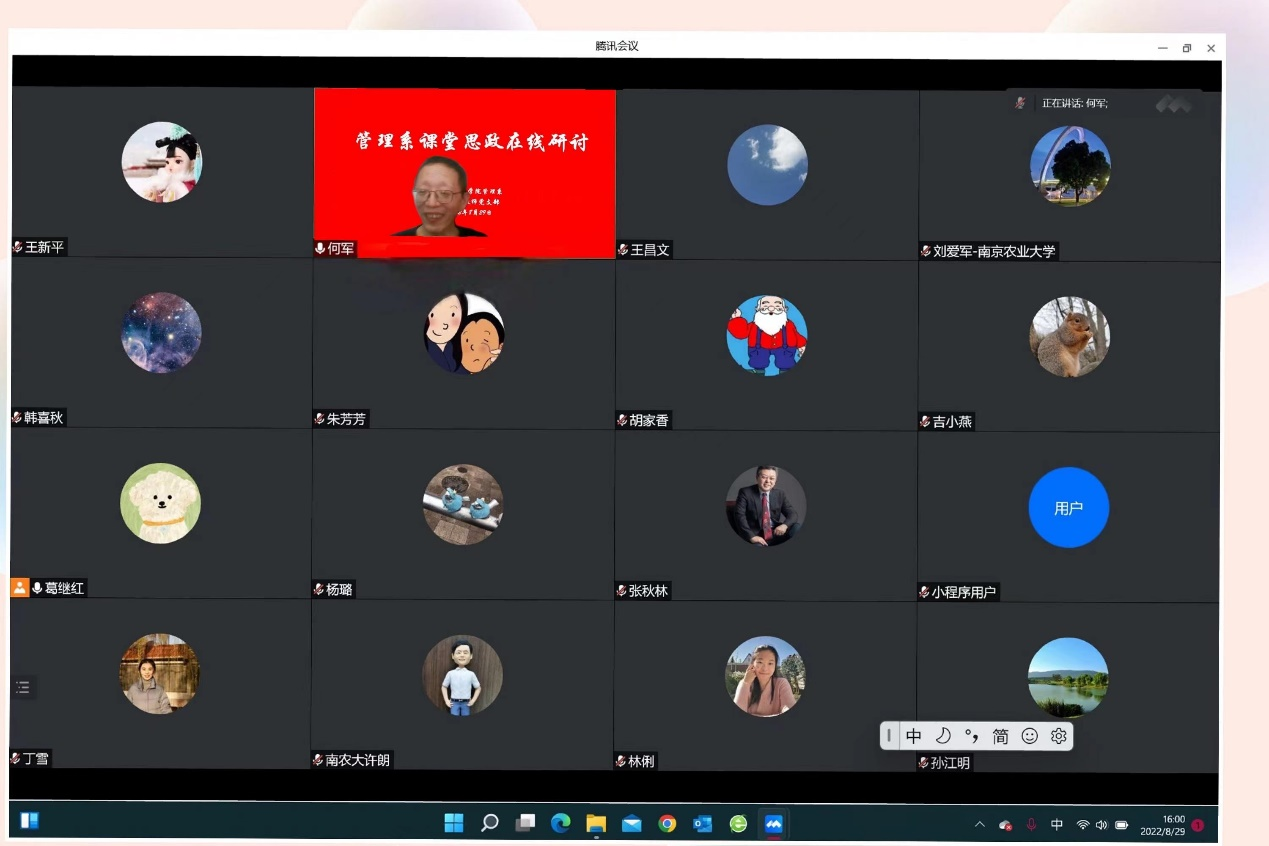 2022年8月29日下午,白菜导航所有网站网址管理系“课堂思政主题研讨会”在线举办,本次活动同时也是管理系教师党支部以“党建教学双融合”开展支部活动,发挥党支部战斗堡垒工作的重要体现。会议由管理系系主任何军教授主持,周曙东教授、陈超教授、常向阳教授、葛继红教授等20余位老师参加了研讨会。