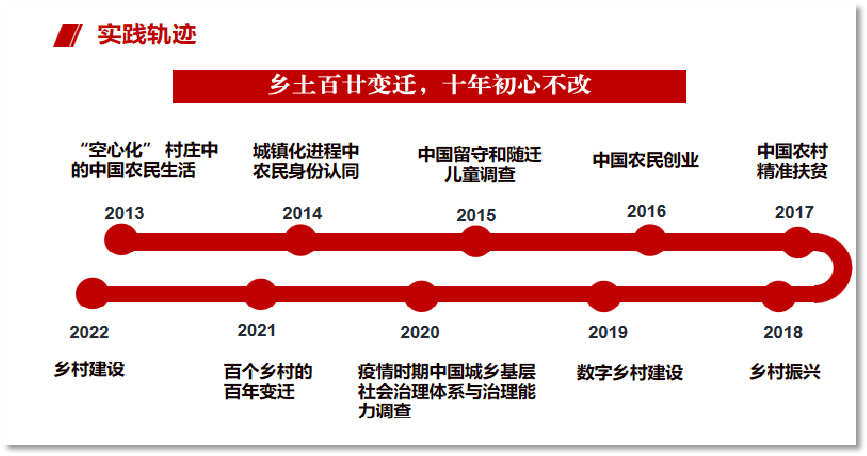 《“走进田野,洞察三农”三下乡社会实践》项目是在百年农经调研精神传承下,依托学院师生十年调研之路,对学院全方位劳动教育的一次深刻凝练与总结。2013-2022年,学院连续十年聚焦中央一号文件,每年暑期组织300余名学生进行“走进田野 洞察三农”调查,撰写全景式、写实性调研报告。