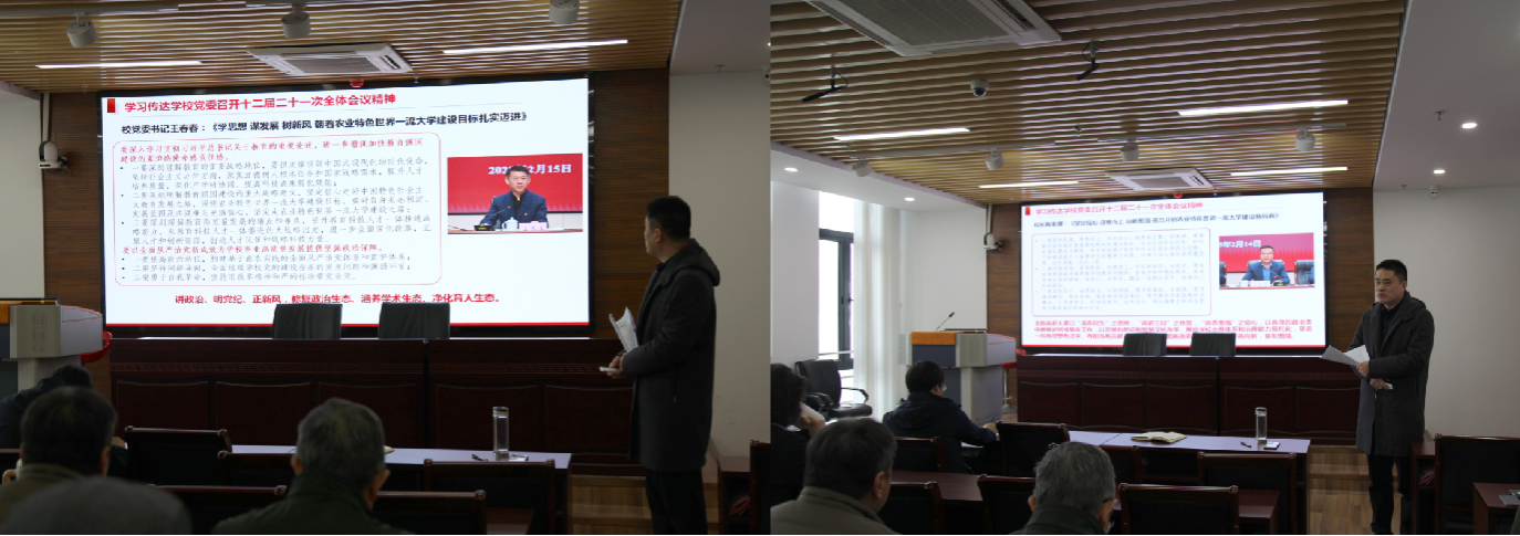 院党委书记孙雪峰向全院教职工传达了中共白菜导航所有网站网址第十二届委员会第二十一次全体会议精神,重点传达了校党委书记王春春、校长陈发棣的大会报告精神。他强调经管学院深入学习贯彻校党委第二十一次全委会精神,构建了"三位一体"学习矩阵,学院党委理论中心组、教师党支部分别开展专题研学,围绕新学期大会精神,对标学院发展定位与规划深入研讨。