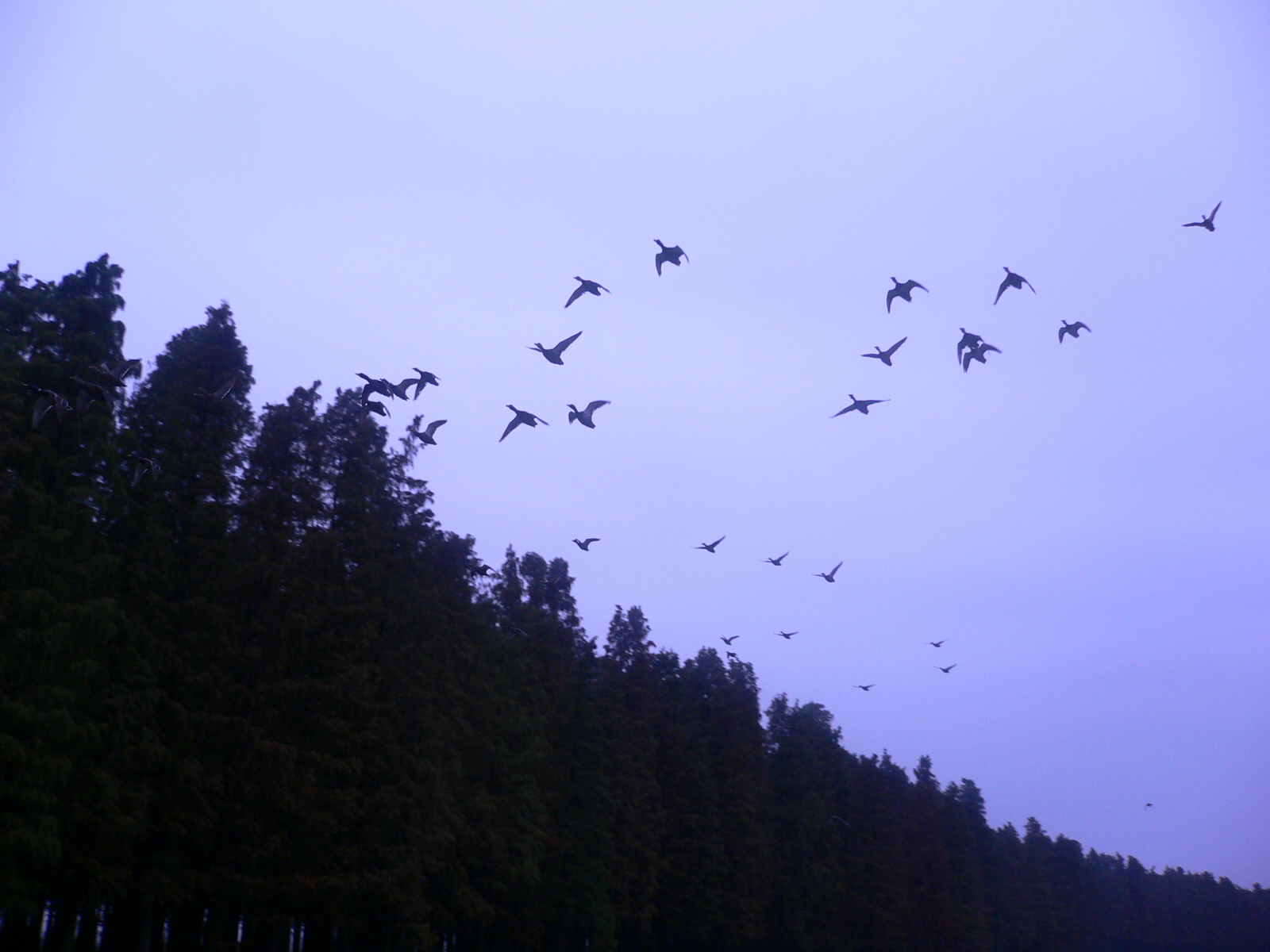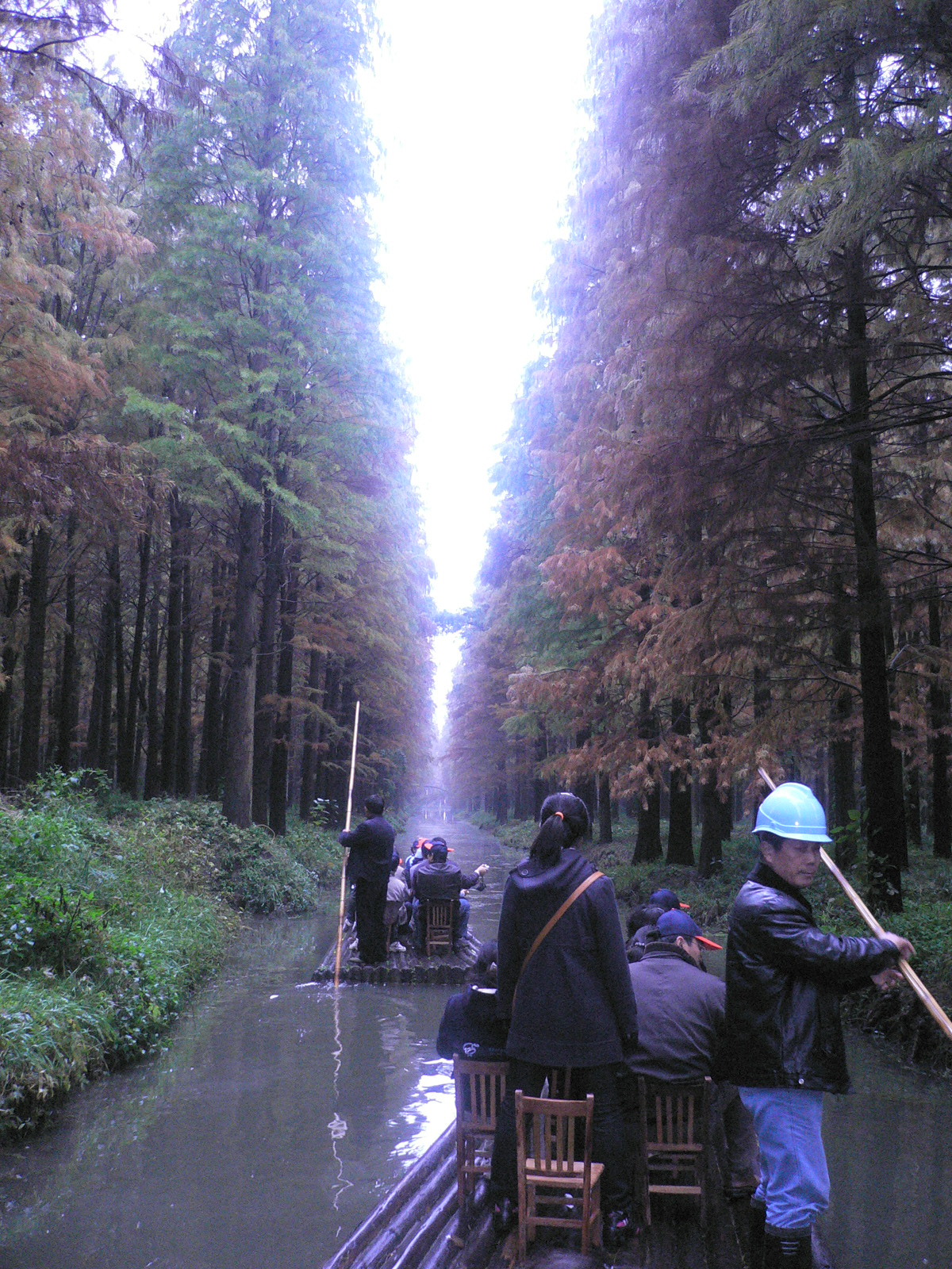 夜宿泰州新世纪饭店。次日,依旧兴致盎然,驱车前往泰州兴化。《水浒传》作者施耐庵、 “扬州八怪”代表人物郑板桥居然皆寓居于此。在纪念馆停留片刻,对兴化的名人才俊有了更多的了解,更对整个泰州地区的昌盛人文心悦诚服。日上中天,在兴化的湖鲜餐厅,我们享用了此行最丰盛的一次大餐。洋河的白酒和美味的螃蟹催生了我们红红的脸颊和迷离的眼神,游玩的兴致却更加盎然。最后一站,我们来到了独具特色的兴化李中镇水上森林公园。以前听说过森林在山上、在陆地,今天却要平生看到森林在水上的胜景了,心头颇为畅快。分批乘上竹筏子,船工撑着长长的竹篙,我们就这样如此亲近的行驶在波澜不惊的水面上了。悠悠的前行,湖里清晰的倒影,我宛若听到了岁月光阴缓缓流逝的声响,听到了自己平和押韵的心跳。拐进水域深处,水渠愈加平静局促,倏然,两岸万株水杉贴着水面拔地而起,演绎成江苏省最大的人工生态森林。蜿蜒的湖荡被两岸的高大水杉层层淹没,一条狭长的空隙连接天际,宛若坐井观天。转过一个水湾后,水面复豁然开朗,但依然平静如镜。正值我们悠悠谈笑间,映着天光水色,一群野鸭蓦然腾空而起,一举打破了水面原有的静谧和安详,铺天盖地地从我们头上掠过,宛如二战时超低空飞行的盟军战斗机群。船队即刻喧闹起来,大家欢呼雀跃,同事纷纷站立起来举起相机抓拍这被惊起的一滩飞鹜。没有拍到野鸭的同事正在遗憾之时,又有更加壮阔的一群野鸭奋力起飞,更加强有力地在我们头顶倾泻而过,莫非这群野性的飞禽是在向我们展示它们傲然的空中翱翔能力和整齐的团队造型吗。登岸后,水面上的渔民向我们展示了鸬鹚抓鱼的本领,鸬鹚被号令下水,顷刻间,一条重约