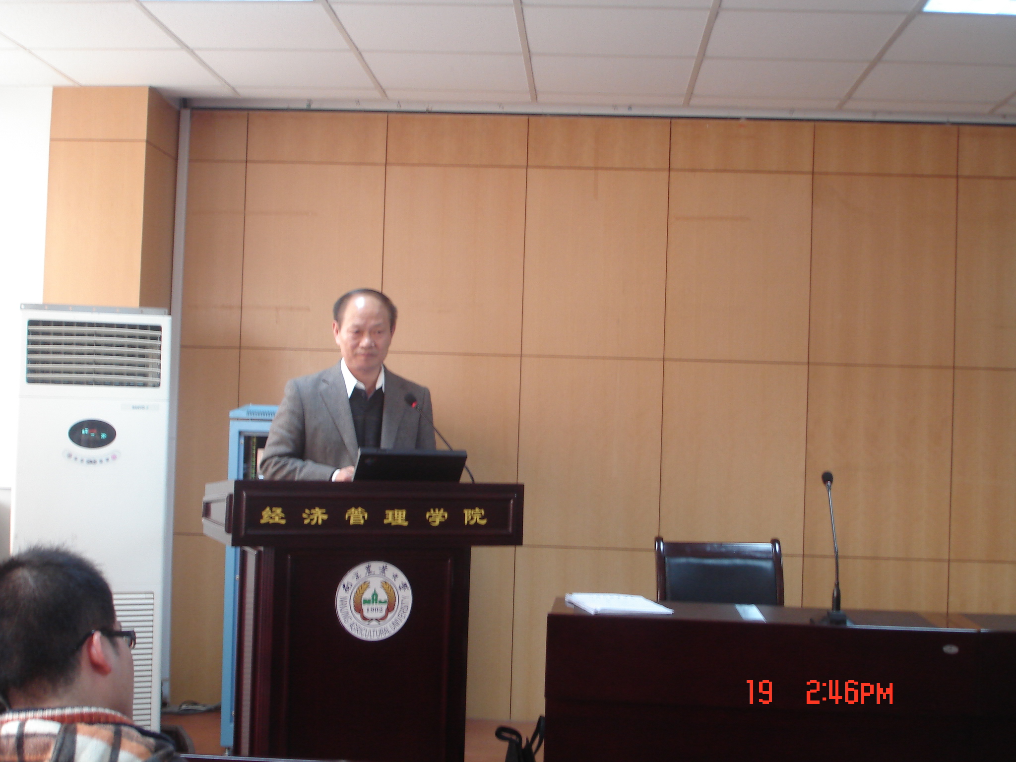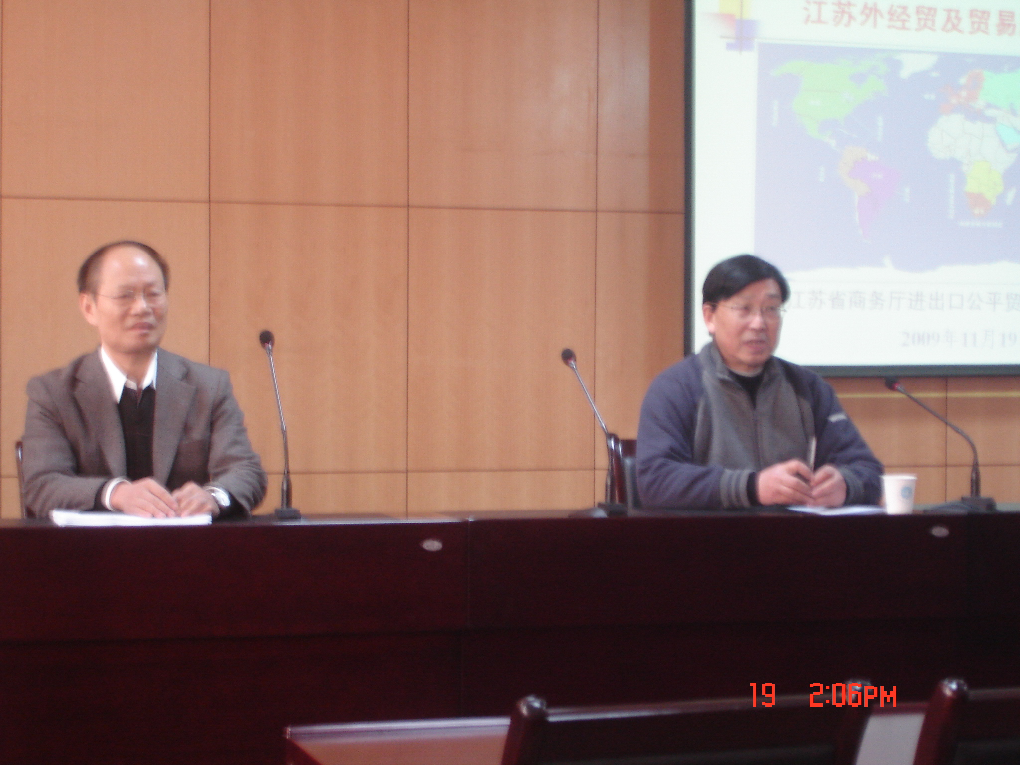 2009年11月19日阳光和煦,下午2:00白菜导航所有网站网址报告厅5045迎来了一位特别的教授——丁育生局长,他既有领导的风采,又有学者的渊博。他为我们带来了一场题为“江苏外经贸易摩擦现状”的学术报告,李岳云教授主持了本次报告会。