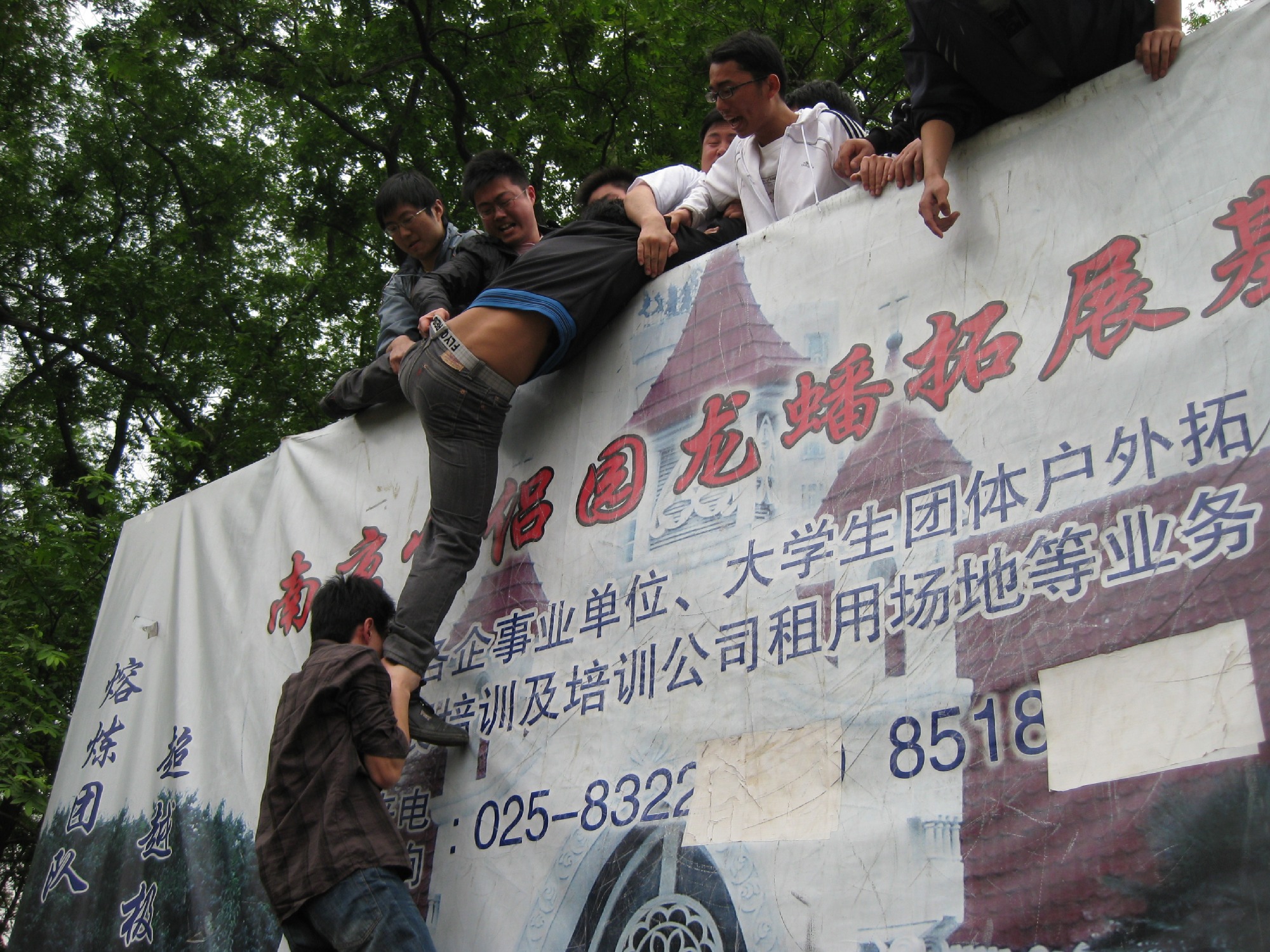 在“甲板逃生”版块中,面对4米高墙,男生们的手脚、肩膀都成了支持队友翻越高墙的工具。项目进行到还剩最后两人的时候是最困难的,需要其中一位同学拉着另一位同学的腿,大家一起被带上去。一开始,李启春同学抱着顾明同学的腿一起被往上拉。但在快要成功的时候,李启春没有坚持住,掉下去了。这时需要实施替代方案,由高墙上的一位同学再次被放下去,将自己的腿作为李同学向上攀爬的受力点,林强同学关键时刻挺身而出,拔“腿”相助。最终,大家齐心协力把两个人拉上了“甲板”,所有人有惊无险,顺利“逃生”……