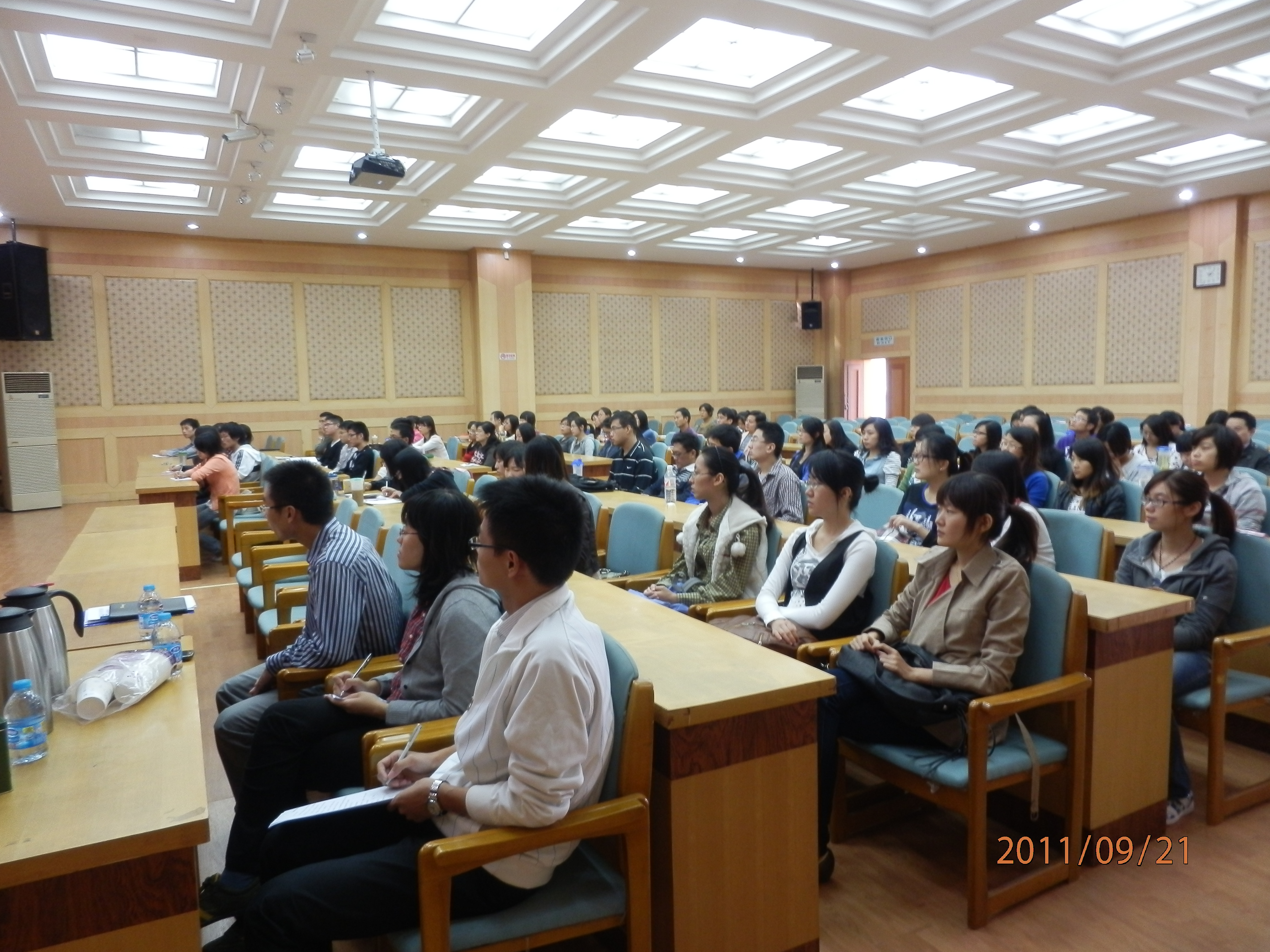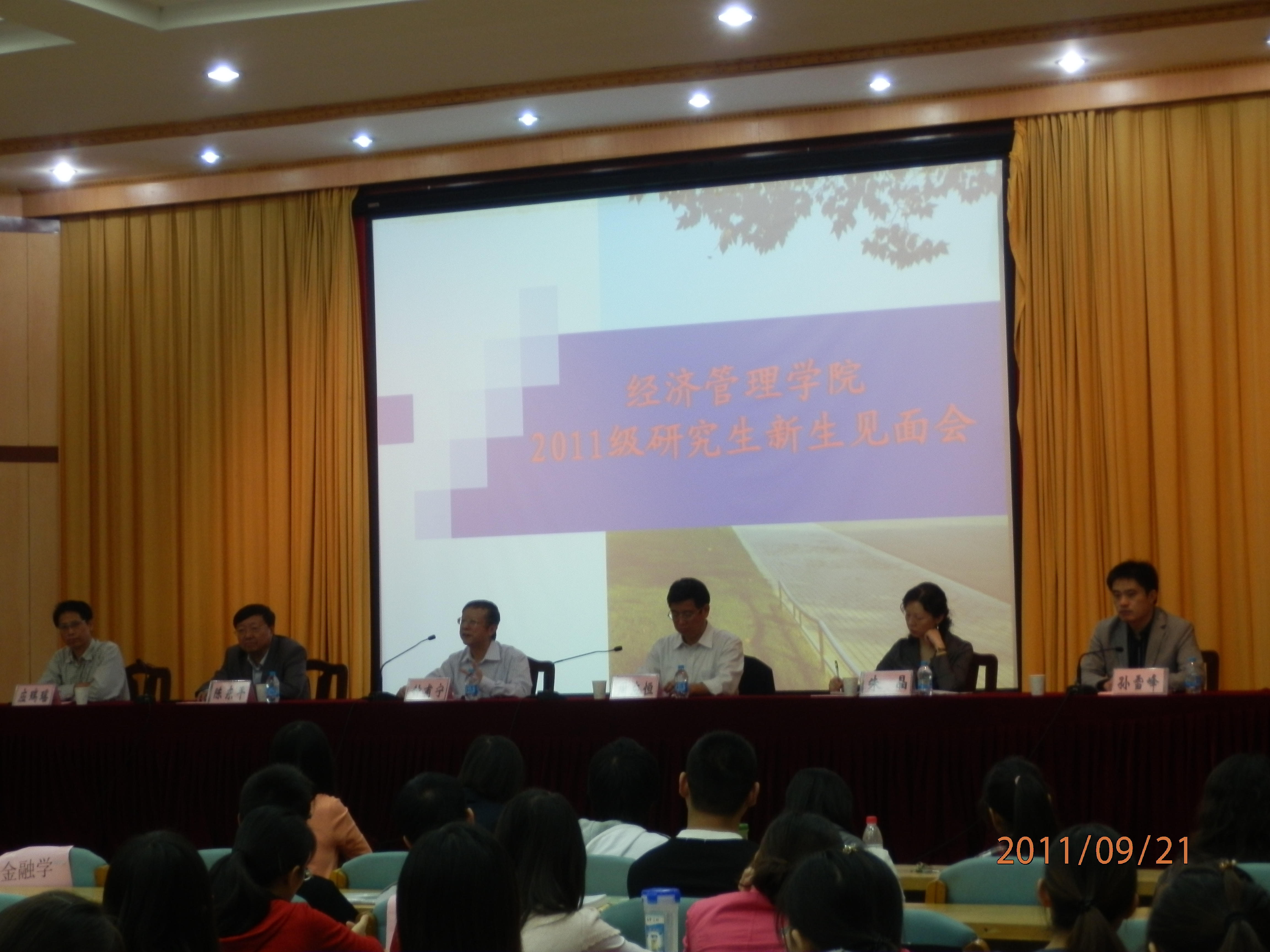 2011年9月21日下午3点,经管院2011级研究生新生见面会在金陵研究院三楼国际报告厅隆重举行。出席本次会议的有陈东平书记,周应恒院长、钟甫宁教授、应瑞瑶副院长和朱晶副院长。孙雪峰副书记主持了本次会议。2011级研究生全体新生参加了此次会议。