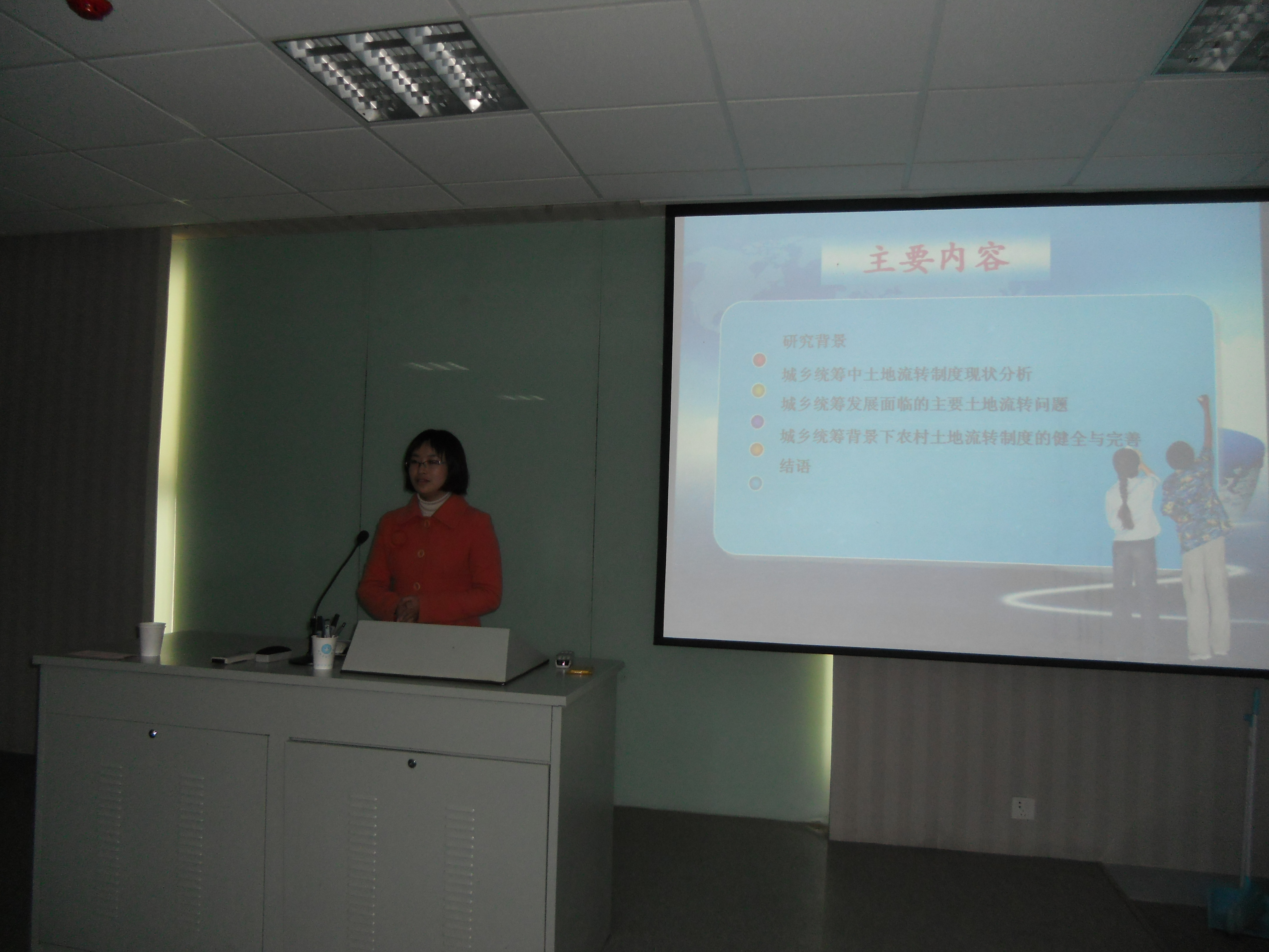 接着上台做报告的是蔡敏敏同学,其报告的题目是《城乡统筹背景下土地流转制度分析——基于重庆忠县复兴镇的调研报告》。文章认为我国已进入二元经济向一元经济转化,城乡统筹发展的关键时期。通过在对重庆市忠县复兴镇的调研基础上,进行城乡统筹背景下土地流转制度创新的成效分析和问题分析,总结相关经验和教训,认为促进农地流转、扩大农业经营规模的根本途径在于农业劳动力的转移,要改进农村内部土地流转制度,留住农业示范户,建立健全农村土地流转市场体系。何军老师认为文章的主线应该更加清晰,要考虑规模报酬递增在工业上的应用是否适用农业的发展规律,应多加关注农业经济方面的法律法规与现实状况,为文章建立起更加鲜明的立足点。