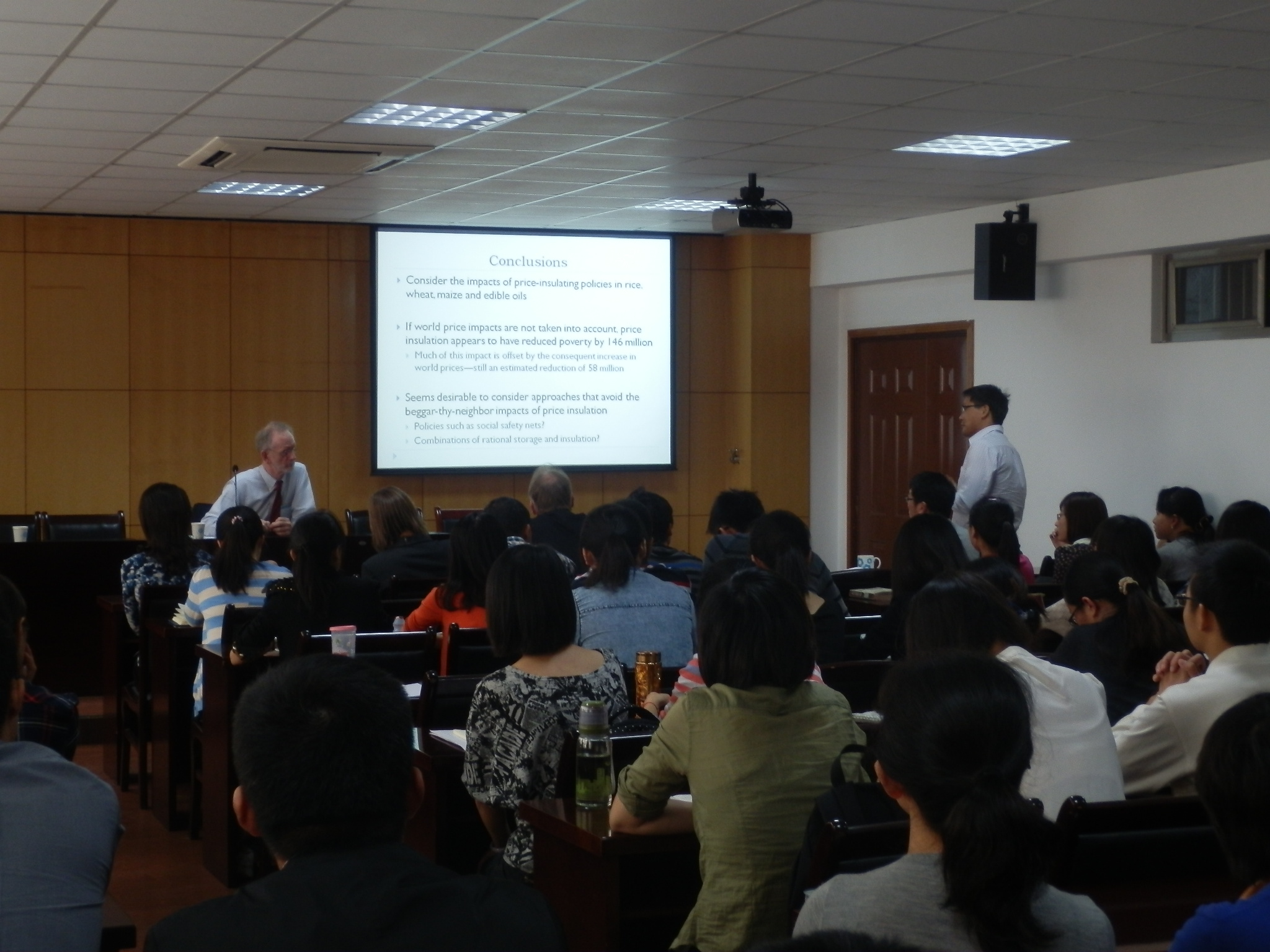 10月12日上午9:30,白菜导航所有网站网址110周年校庆系列活动暨白菜导航所有网站网址名家讲座在经管院学术报告厅(逸夫楼5045)召开,The Effects of Price Insulation on Poverty国际农业经济学会主席、世界银行农业与农村发展研究部主任Will Martin博士作了题为“The Effects of Price Insulation on Poverty”的报告。经管院广大师生参加了此次报告,报告会由经管学院钟甫宁教授主持。