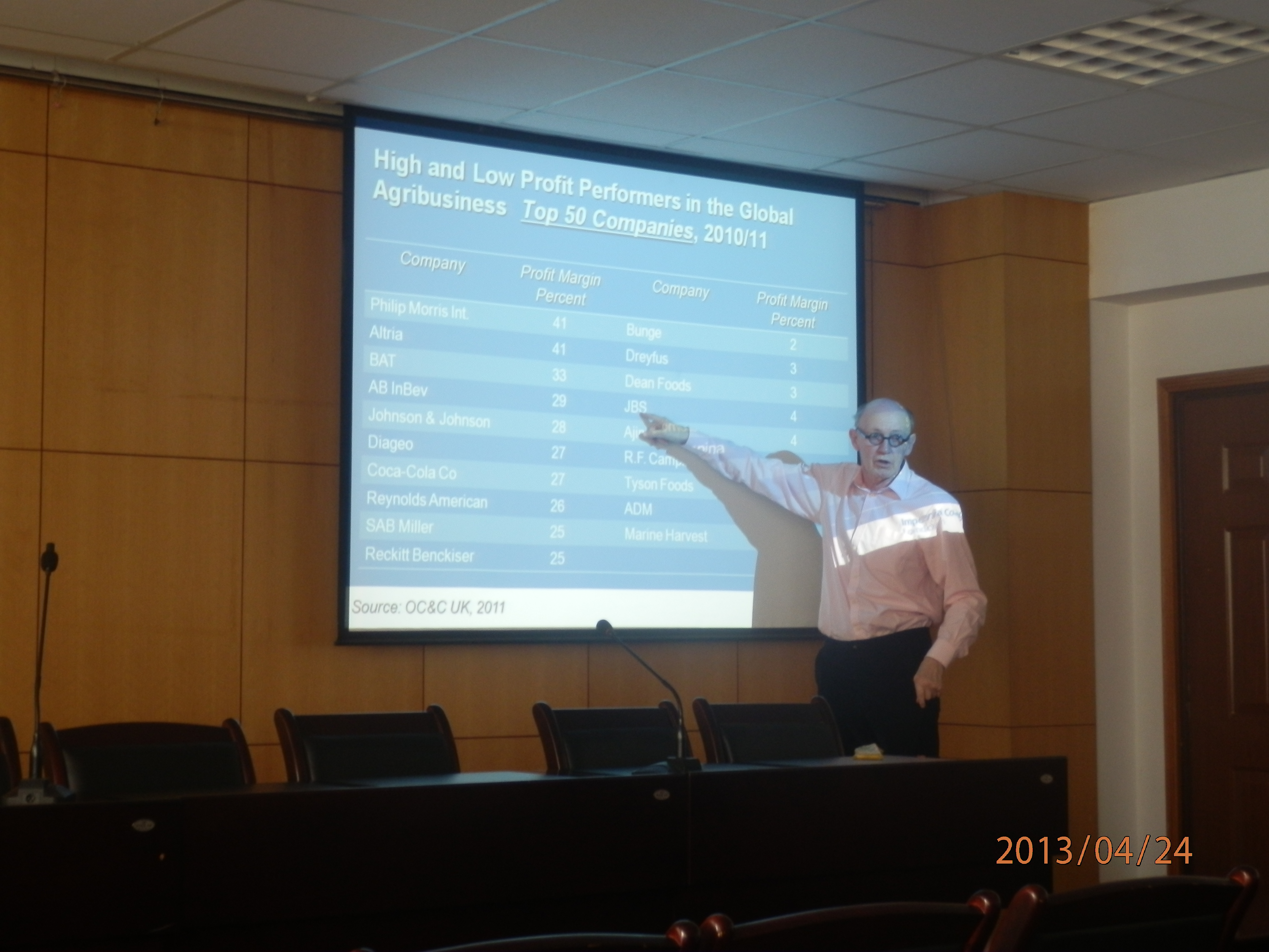 David Hughes教授首先以美国零售巨头沃尔玛为例引出高利润的一些烟草、饮料公司以及低利润的其他食品公司。随后,他提出发达国家老年人口相对于青少年更多,即人口老龄化现象比较严重,发展中国家刚好相反,由此二者的食物消费情况相差较大。中国的肉蛋消费占世界的比重较大,尤其体现在猪肉鸡蛋等方面,其原因首先是人口量大,另外是中西方饮食习惯迥异,中国饮食对猪肉更加偏爱。紧接着,他预测了亚洲国家肉类消费趋势:中国增长较快,台湾地区紧随其后。根据FAO公布的1990—2013的全球粮食价格指数波动情况,David教授向大家详细介绍了在08年以后粮食价格频繁波动的具体原因。