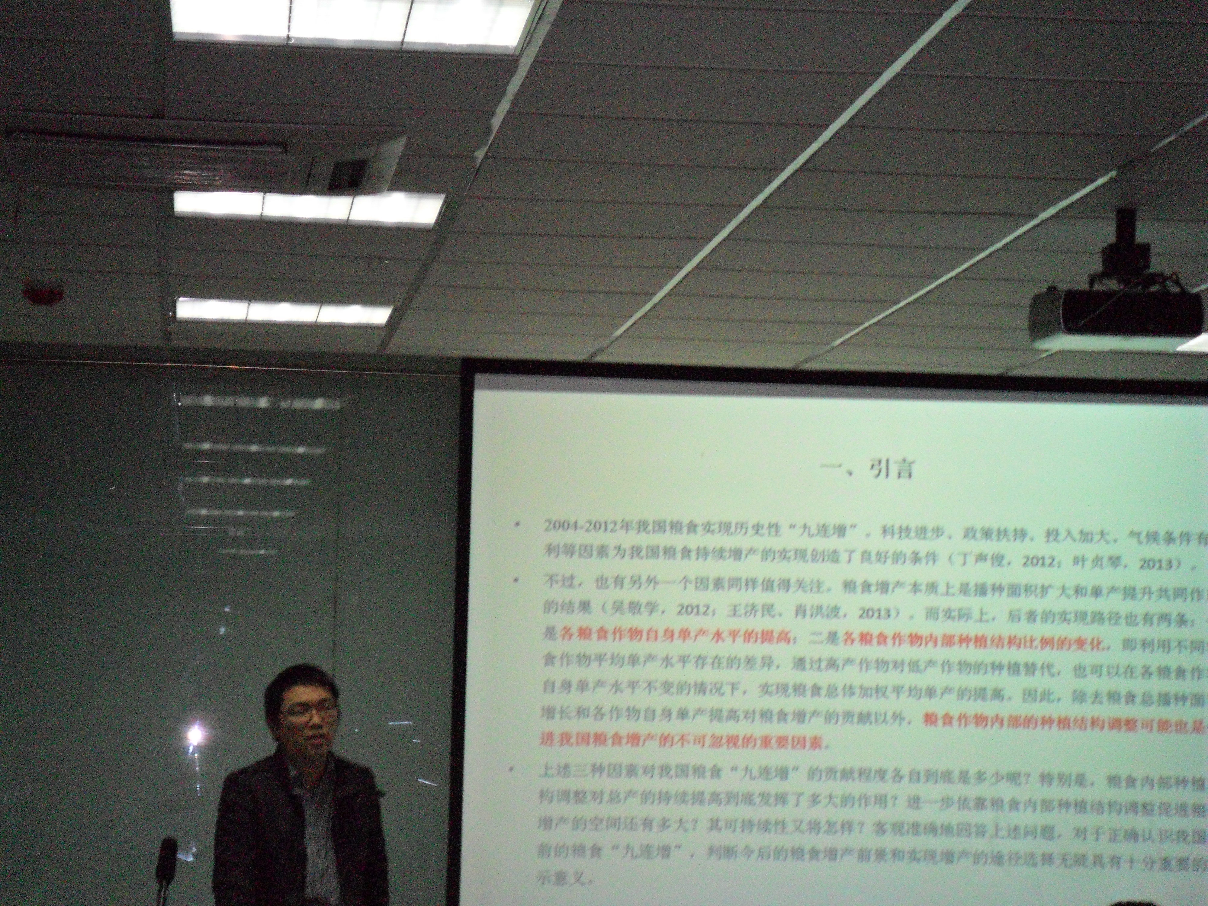 李天祥同学汇报的题目是《“九连增”后的思考:粮食内部结构调整的贡献及未来潜力分析》,文章基于“九连增”的背景之下,研究粮食播种面积的增加、作物内部种植比调整、种植结构的调整分别对粮食单产增加产生的影响,通过数学公式测算出各自贡献率,归纳其调整的动因,最后对其未来潜力做出简要分析。苏群老师对文章给予了较高的评价,认为文章对数据的利用较为到位,总体思路较为清晰,但希望文章在语言表达上更加凝练。
