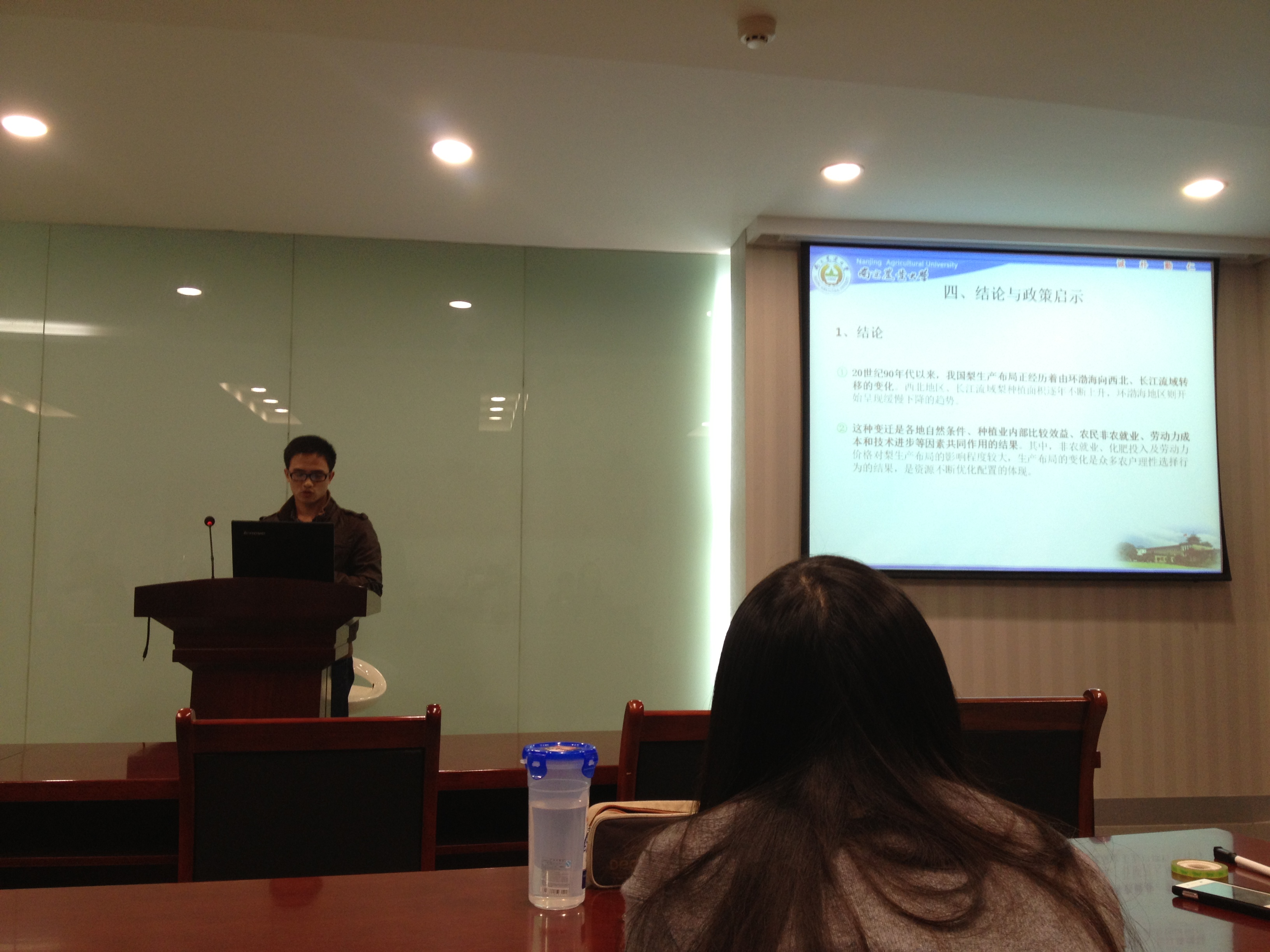 最后进行汇报的是卢华,他汇报的题目是《我国梨生产布局变迁及其影响因素—基于省级面板数据分析》。文章通过对梨生产现状、布局变迁特征以及比较优势分析得出结论:我国梨的生产重心正慢慢发生变化,逐步由环渤海地区向长江中下游及云贵地区、西北地区转移;同时根据对省级面板数据进行广义最小二乘法估计的实证分析,认为变迁是各地自然条件、种植业内部比较效益、农民非农就业、劳动力成本和技术进步等因素共同作用的结果。最后周力老师做了详细点评,他指出论文本身比较规范,以具体产业为例和中国梨产业体系作为支撑,这是很好的尝试。但论文本身由于采用多因素分析,结构稍显混乱,没有主线;同时影响因素自变量的选取存在内生性问题;由于没有涉及梨成本和收益,数据稍显不足。