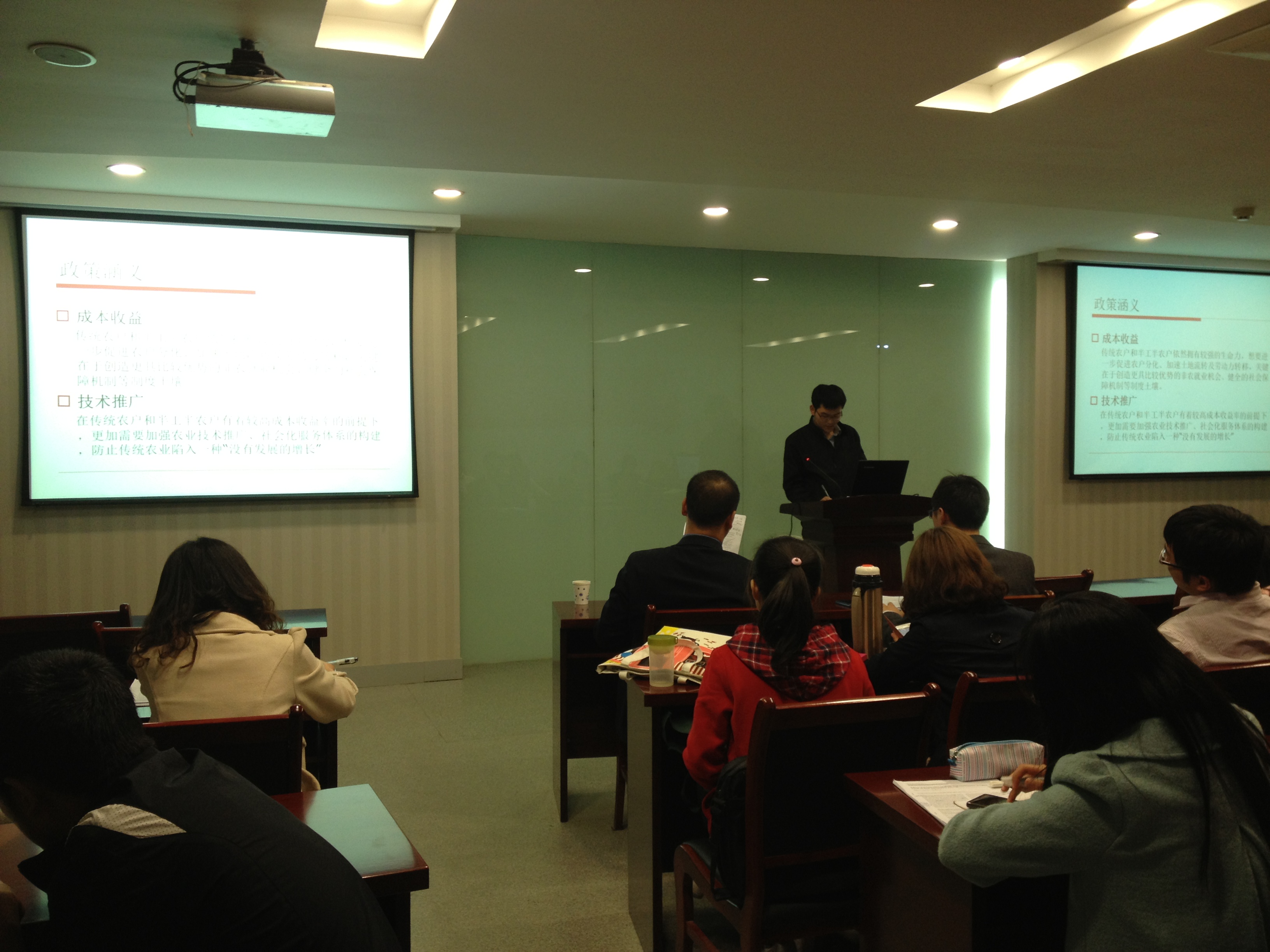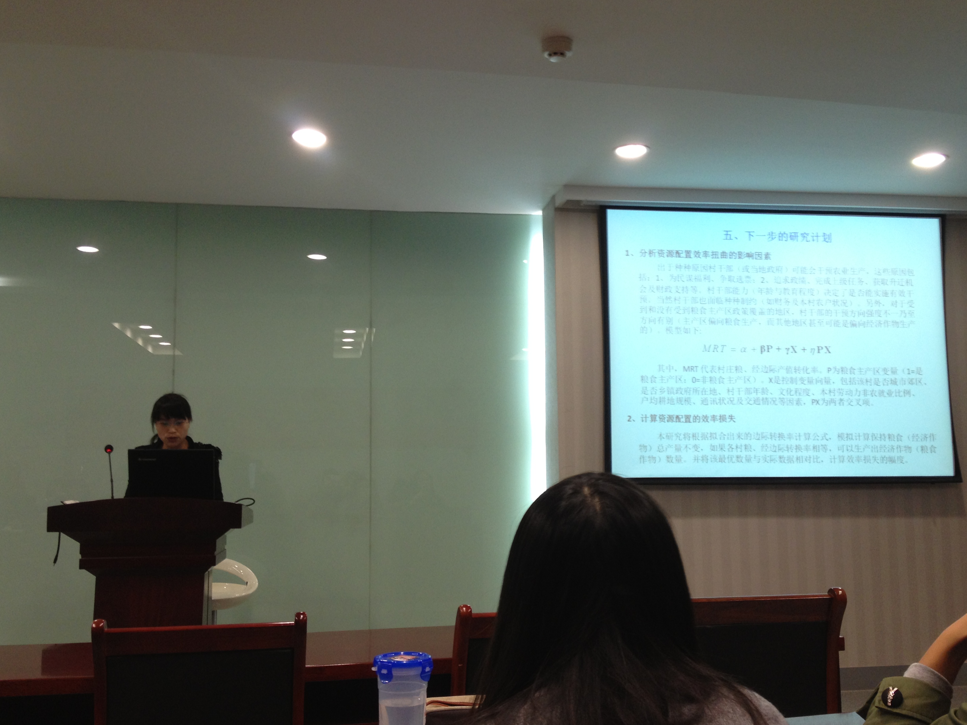 首先上台的是林大燕,她所作报告的题目是《进口粮食生产干预与农业资源配置效率损失 ——兼论比较优势与种植结构调整》。本文通过政府粮食生产干预政策引发对农业生产资源配置扭曲导致的效率损失问题的研究,并建立多产出生产函数测算出产品的边际转化率及比较优势,分析其遭受扭曲而偏离粮、经产品价格比的程度。最终通过计量模型卡方检验得知:我国粮经作物的生产存在扭曲,农业资源配置存在无效率现象。且从数值上看,粮食生产干预政策在粮食主产区往往更容易实现。展进涛老师对该汇报做了详细点评,首先他认为该论文结构完善、研究细致,但也指出文章存在模型形式设定错误、缺乏政策干预对要素扭曲的影响机理分析、主产区前后界定差异等问题。
