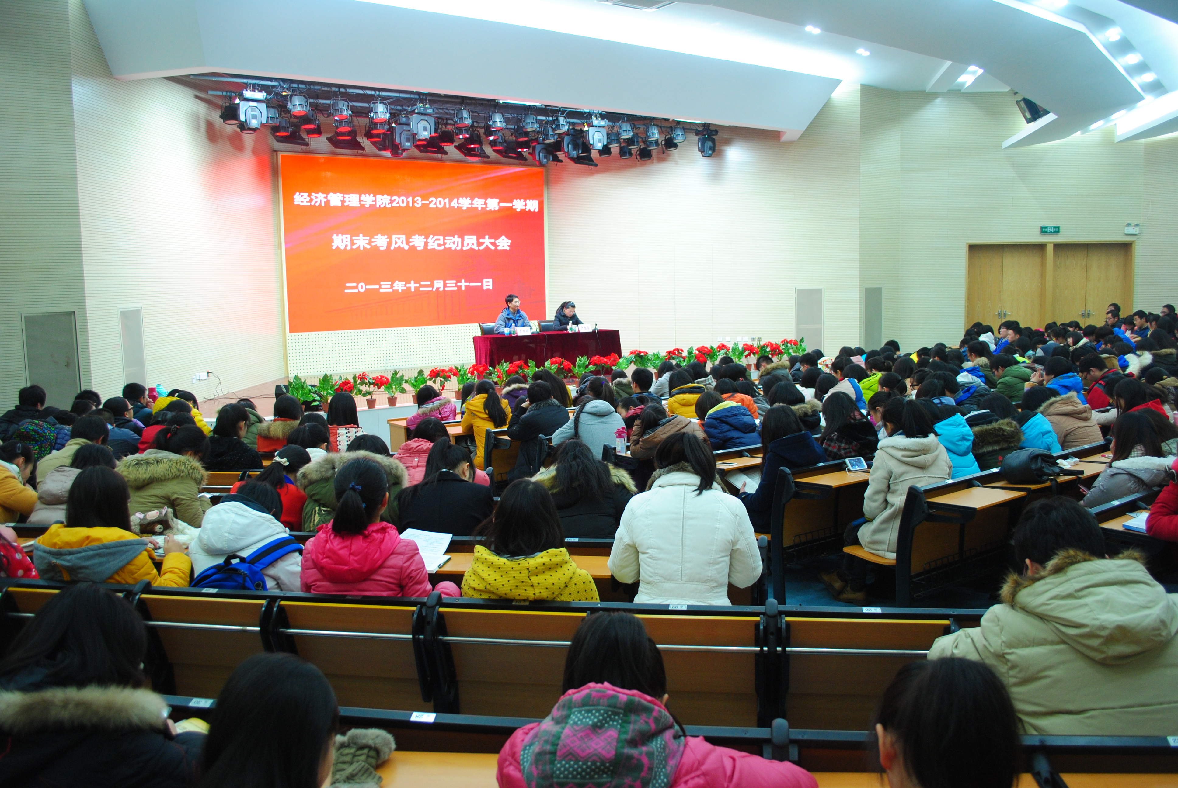 为严肃考风考纪,白菜导航所有网站网址于2013年12月31日在大学生活动中心召开了年度考风考纪动员大会,学院副院长应瑞瑶出席大会并作动员报告,学院党委副书记卢忠菊主持会议,400余名本科生参加了此次大会。