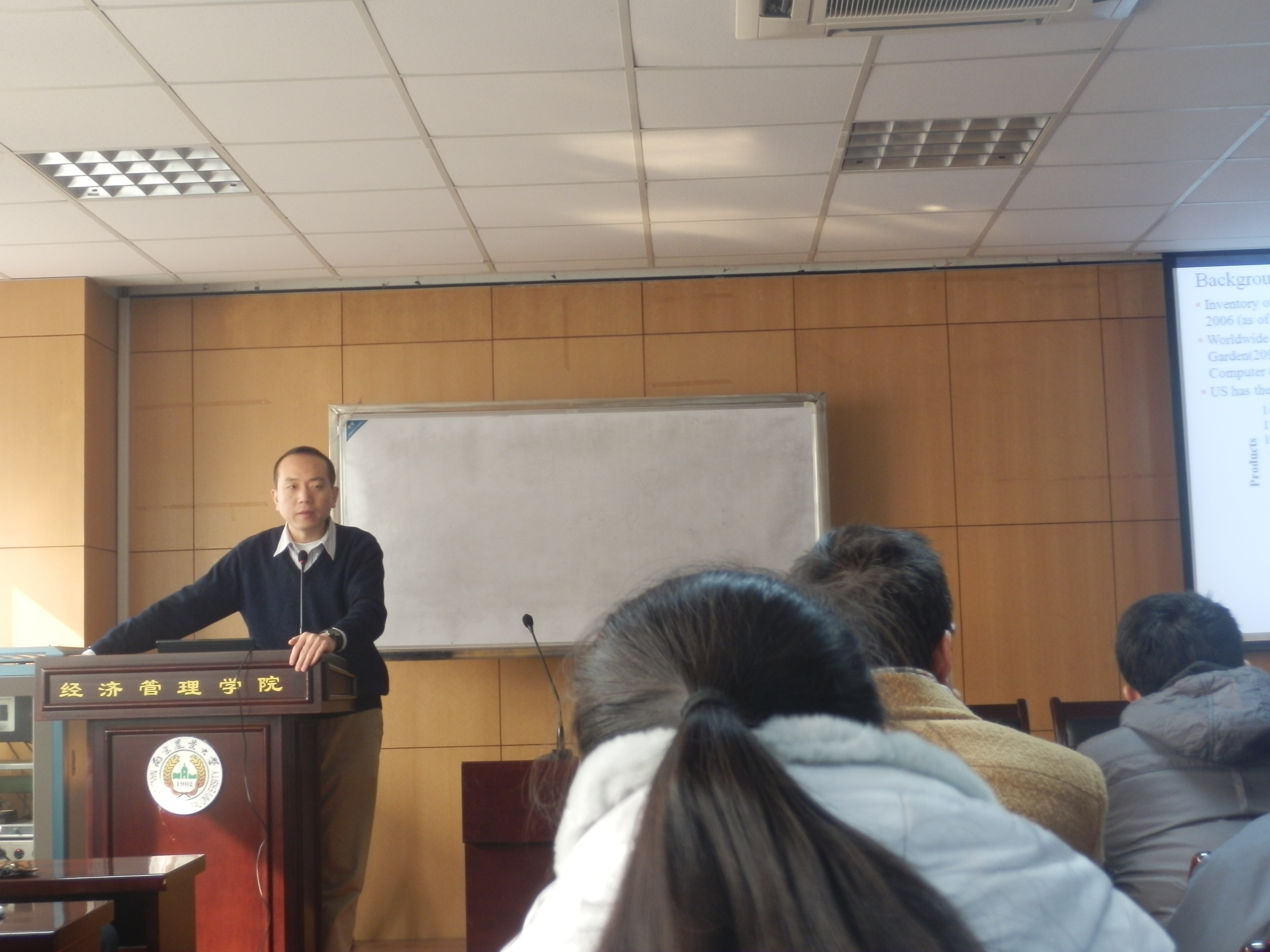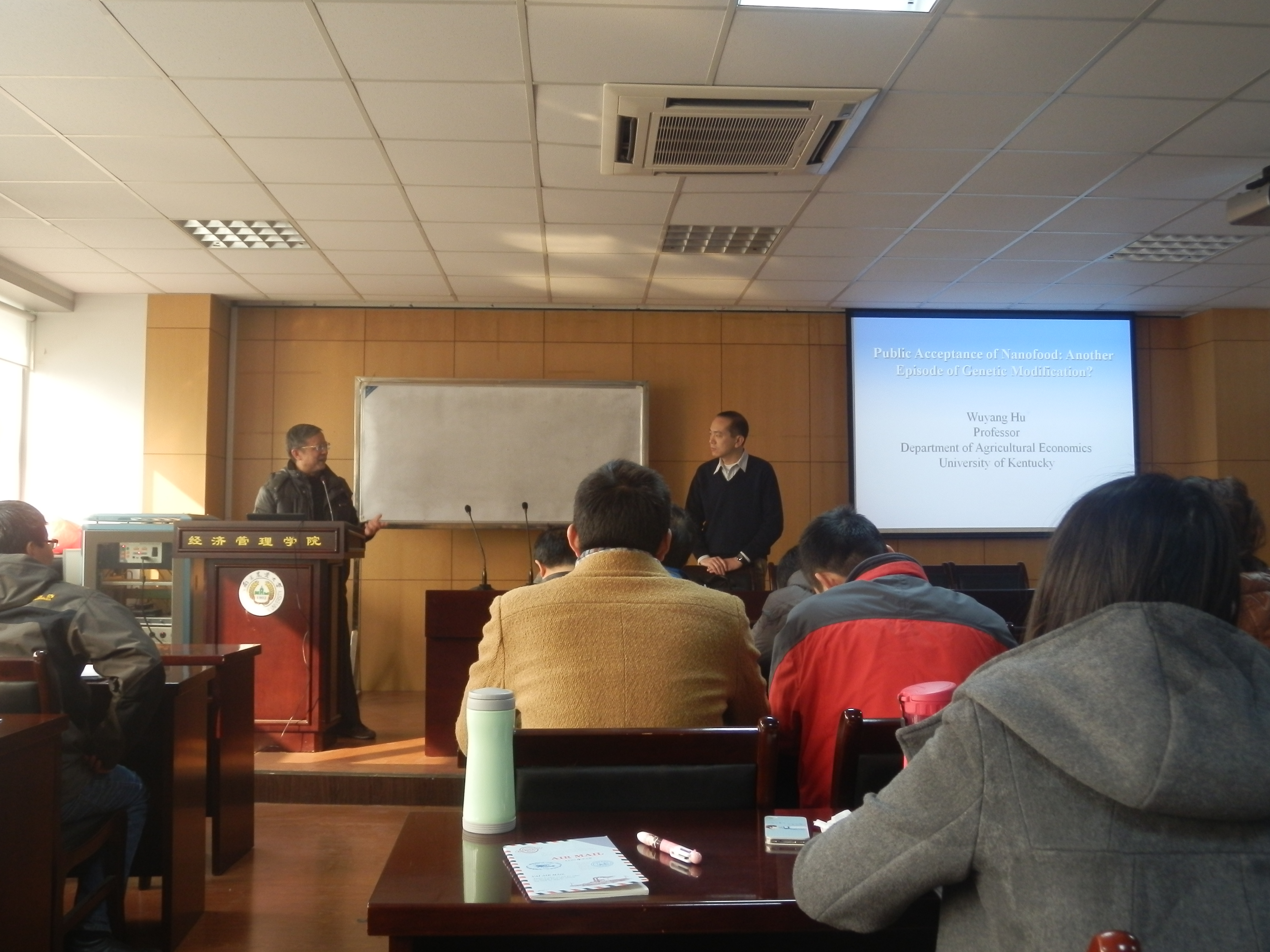 2014年1月3日上午10点,SCI/SSCI期刊《加拿大农业经济》主编、美国农业与应用经济协会中国区主席、美国肯塔基大学农业经济系胡武阳教授在逸夫楼5045作题为“Public Acceptance of Nanofood Episode of Genetic Modification”的学术报告,钟甫宁教授主持了本次报告会,本次学术报告吸引了经管学院众多老师及学生参加。