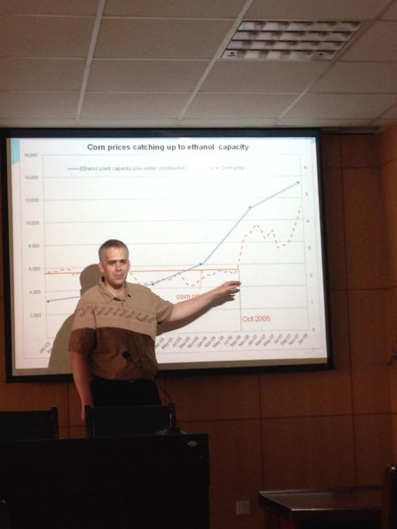 报告以八年的世界粮食和油籽价格动荡、所呈现的繁荣景象、食品的“危机”、发展中国家的政治不稳定、生物燃料政策的作用、其他因素的影响等为背景。报告开始,David教授首先对“Perfect Storm”从经济模型和经济变量两个方面做了解释,接着对农业、金属、能源等进行了价格指数走向的分析以及油料和玉米价格的描述,指出玉米的价格直追乙醇的价格。David教授继而对生物燃料政策的由来做了简要的分析并对相关法律做了描述。报告的第二部分主要讲述了生物能源与谷物等的联系,建立了三个有关生物燃料的模型,从理论上、实证上进行了推导和验证,并比较了预测的玉米价格和真实的玉米价格。报告的第三部分即对玉米的价格与生物燃料的价格进行了比较,利用数据绘成图表并做了详细的分析。报告的最后,David教授指出经济学家对生物燃料的数量关注较多,对价格关注较少,相关研究是具有一定意义的。