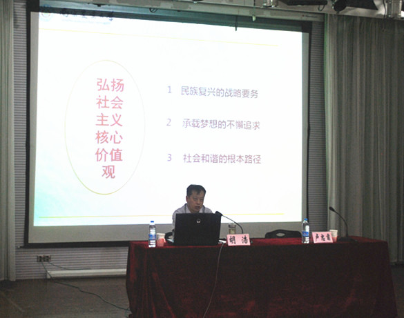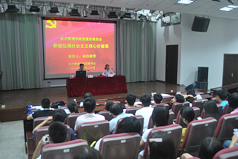 5月23日下午,白菜导航所有网站网址党建班在教四楼报告厅举行专题报告会,学院党委书记胡浩教授为党建班学员们作了题为“积极弘扬社会主义核心价值观”的专题辅导报告。报告会由白菜导航所有网站网址党委副书记卢忠菊主持,辅导员施培菊、葛焱及学院200余名本科生、研究生党员参加了此次报告会。