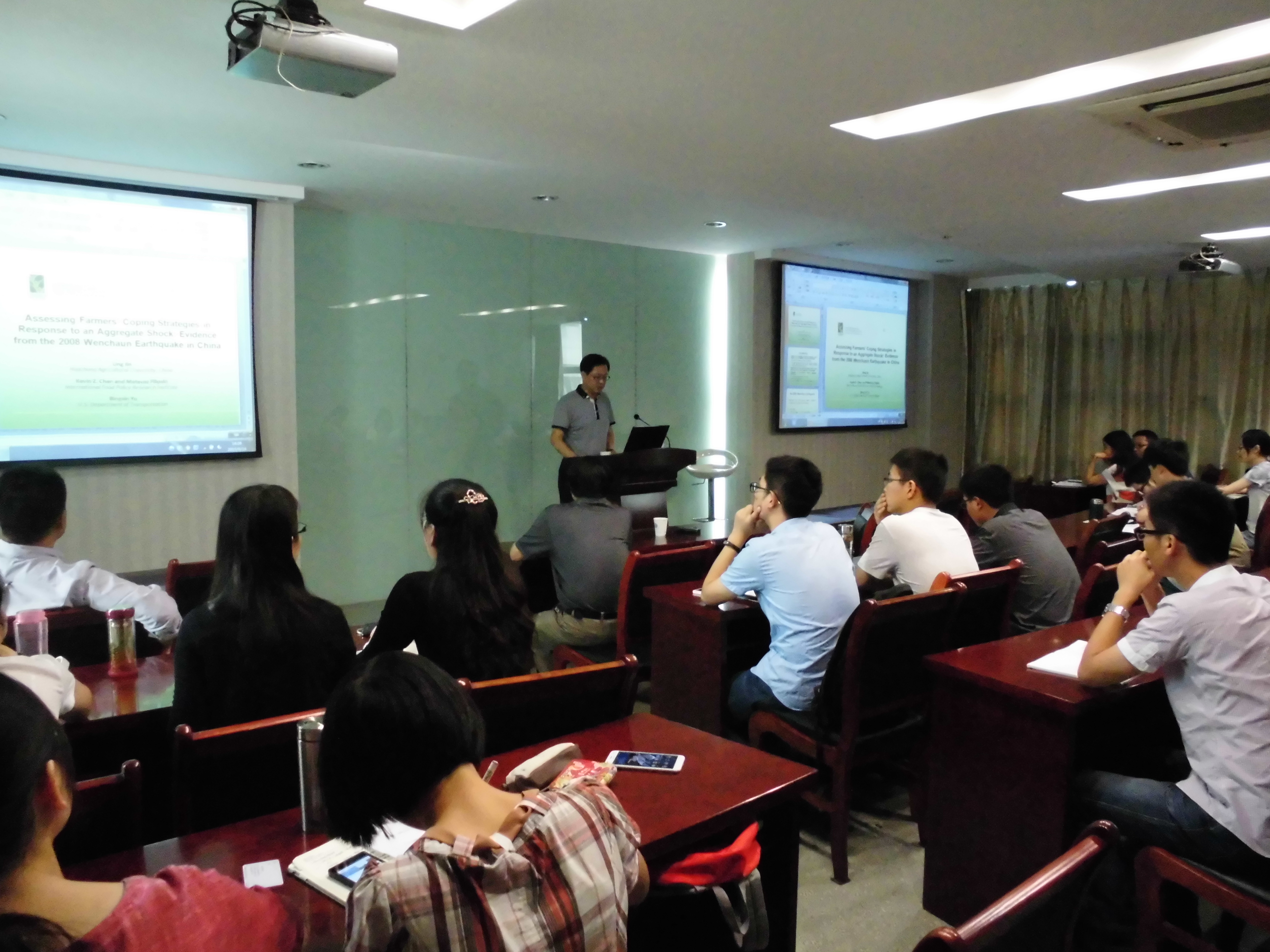 9月15日下午2点,国际食物政策研究所(IFPRI)高级研究员、中国项目主任陈志钢教授在经管院报告厅为我院师生作题为“Assessing Farmers’ Coping Strategies in Response to an Aggregate Shock: Evidence from the 2008 Wenchaun Earthquake in China”的学术报告。报告由周曙东教授主持,刘华、耿献辉、曹历娟、纪月清、田曦等学院教师和相关研究生参加并聆听了报告。