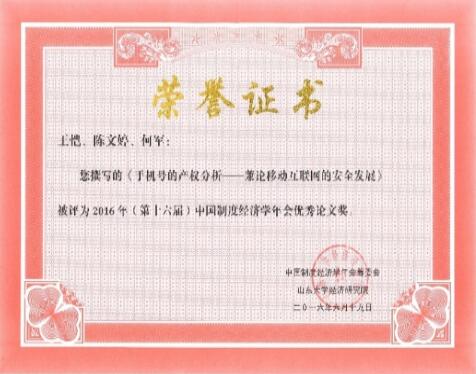 我院何军教授、博士生王恺、陈文婷的《手机号的产权分析——兼论移动互联网的安全发展》一文在参会的120篇论文中脱颖而出,与清华大学、北京大学、山东大学的8篇论文被评选为本次年会的优秀论文。受会议安排,作者代表博士生王恺在大会闭幕式上进行主旨汇报。中国人民大学公共政策研究院执行副院长毛寿龙教授和山东大学经济研究院、山东大学学报(社科版)主编魏建教授给予了积极肯定并提出了宝贵的修改建议。