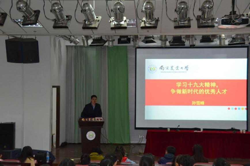 孙雪峰同志以“学习党的十九大精神,争做新时代的优秀人才”为主题做报告,他对党的“十九大”主要成果和精神进行了详细解读。他通过分享李保国、赵亚夫等感人事迹,中外教育成功与失败案例的比较分析,表达了对“不忘初心、牢记使命”理念的认可和追求。他勉励同学们以时代楷模为榜样,勇于争取做一位讲奉献有作为、有历史使命与担当、踏实努力学习、热爱创新的优秀党员,为贯彻学习党的十九大精神、立足当前,为实现“两步走”新目标的发展战略奉献青春。