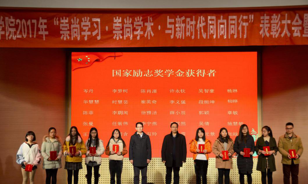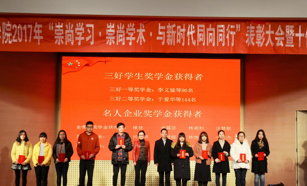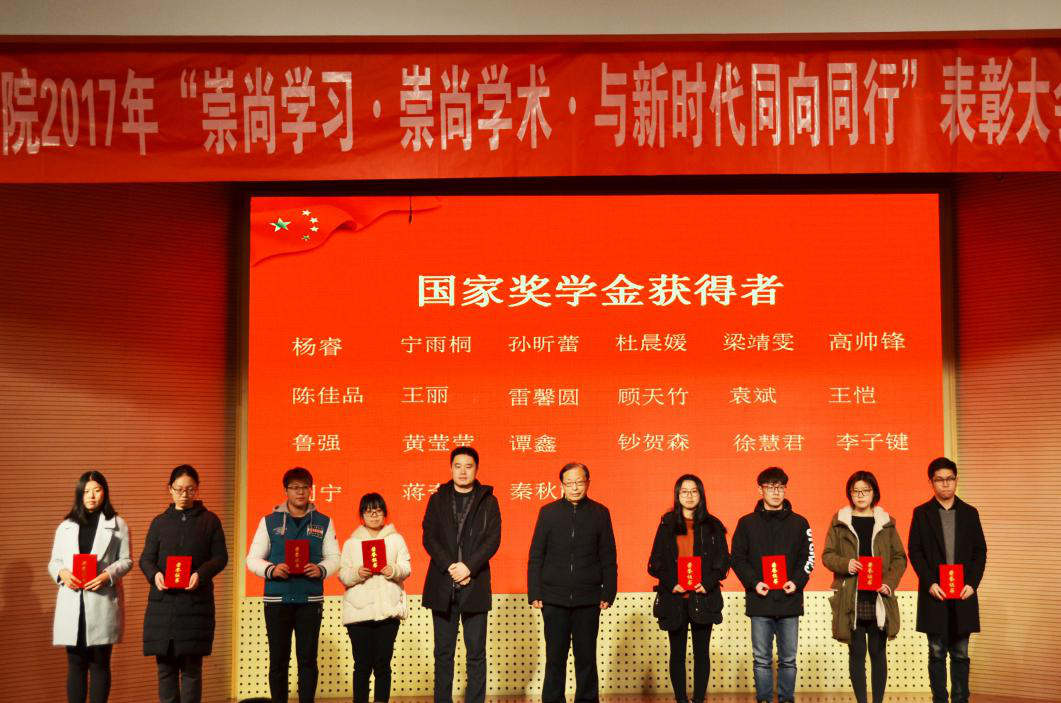 “崇尚学习崇尚学术 与新时代同向同行”表彰大会总结了白菜导航所有网站网址2017年的育人成果,并由出席大会的领导作为颁奖嘉宾分别为优秀干部获得者、刘崧生奖学金获得者、名人企业奖学金获得者、三好学生奖学金获得者、国家励志奖学金获得者和国家奖学金获得者代表颁奖。