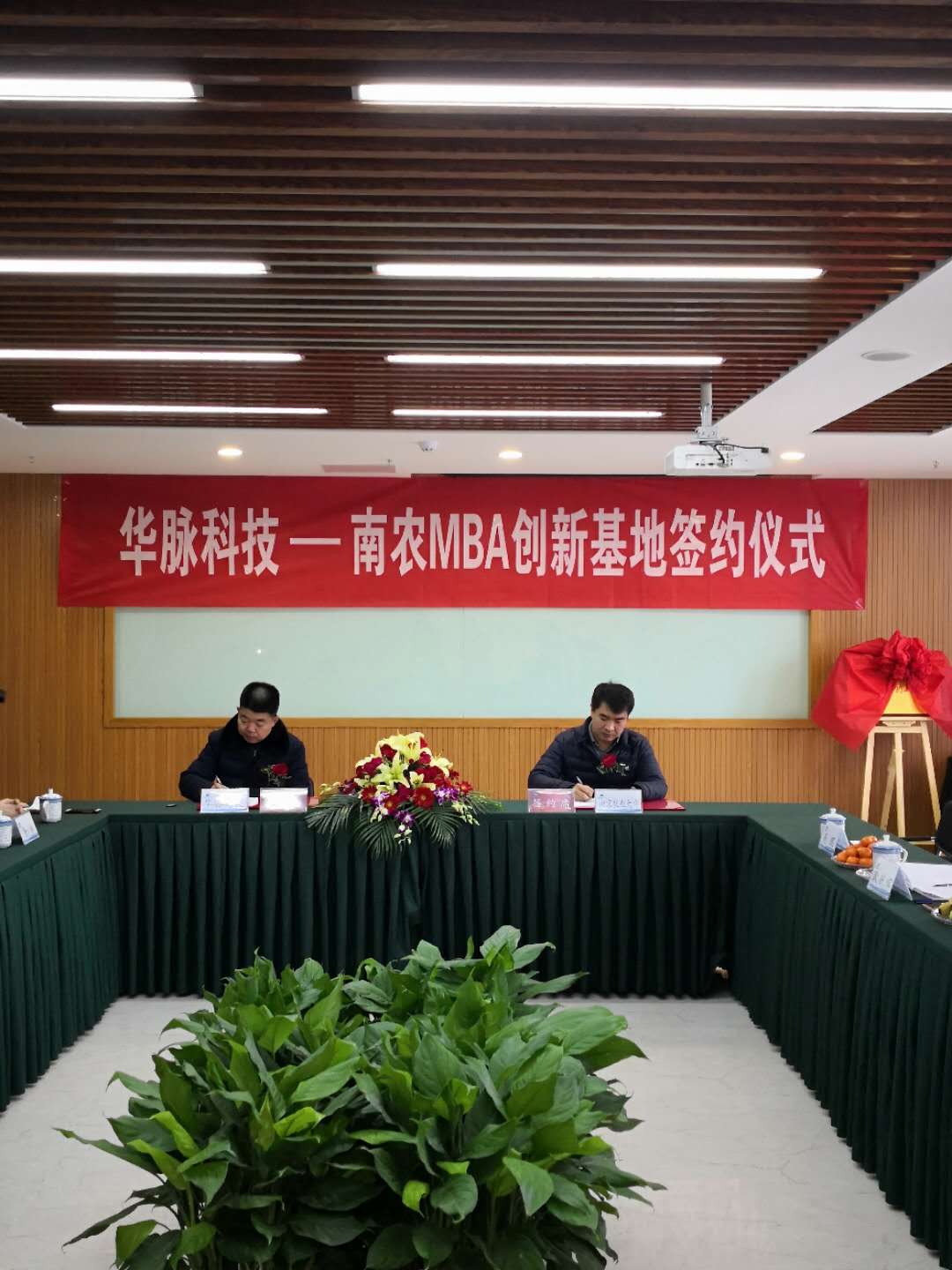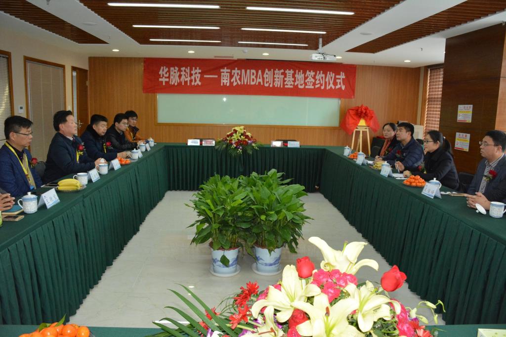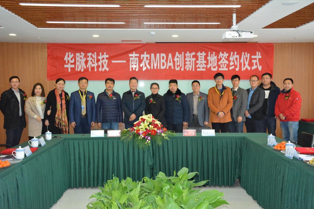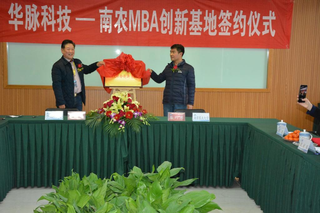 华脉科技总经理姜汉斌和南农经管学院副院长耿献辉作为双方代表在校企合作协议上签字。胥爱民、耿献辉为华脉科技-南农MBA创新基地揭牌。