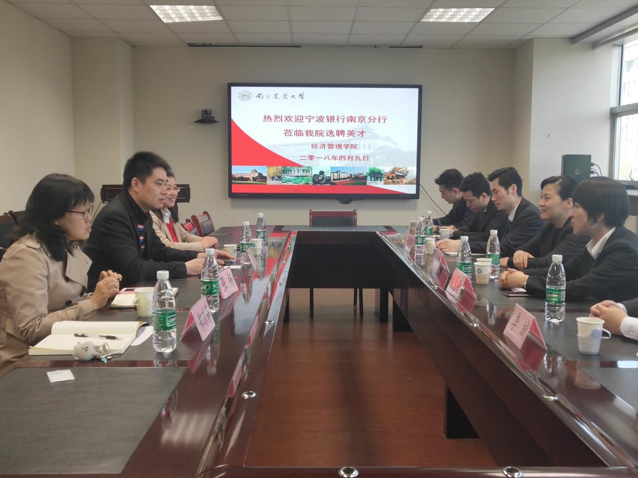 2018年4月9日上午,宁波银行南京分行人力资源部总经理李清、营业部总经理史慧敏等一行来我院招聘毕业生。经管院党委副书记(主持工作)孙雪峰、党委副书记卢忠菊、辅导员郑琼婷、张杨与宁波银行南京分行进行了座谈交流。