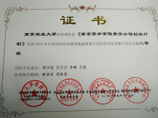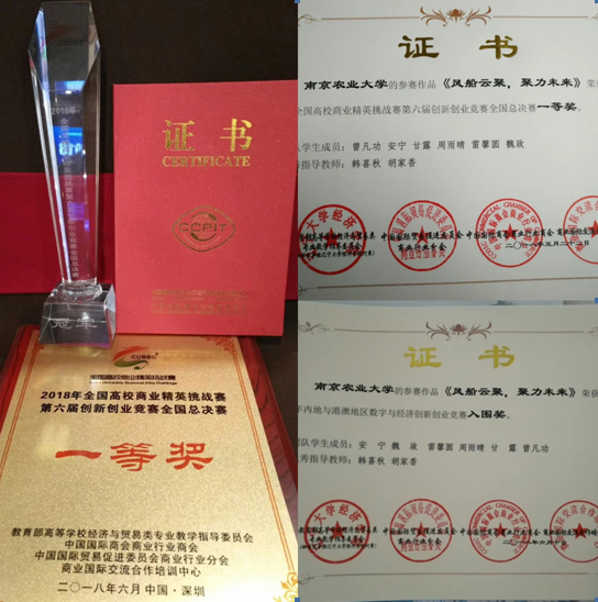 6月8日-10日,2018年全国高校商业精英挑战赛第六届创新创业竞赛在广东省深圳市成功举办。本次竞赛是由教育部高等学校经济与贸易类专业教学指导委员会、中国国际商会商业行业商会、中国国际贸易促进委员会商业行业分会、(国资委)商业国际交流合作培训中心,中国国际贸易促进委员会商业行业分会、(国资委)商业国际交流合作培训中心承办。我院教师韩喜秋和胡家香带领来自农林经济管理、国际经济与贸易和工商管理等专业的本科学生共计8人参加此次比赛,经过激烈角逐,创业组项目《风船云聚,聚力未来》从12组队伍中脱颖而出,斩获总决赛金奖,获得一万五千元奖金,同时取得代表内地参加2018年10月在香港举办的“内地与港澳地区数字与经济创新创业竞赛”的参赛资格。另外,本院提交的参赛方案《南京苏伞有限责任公司创业计划》获创客组全国二等奖。