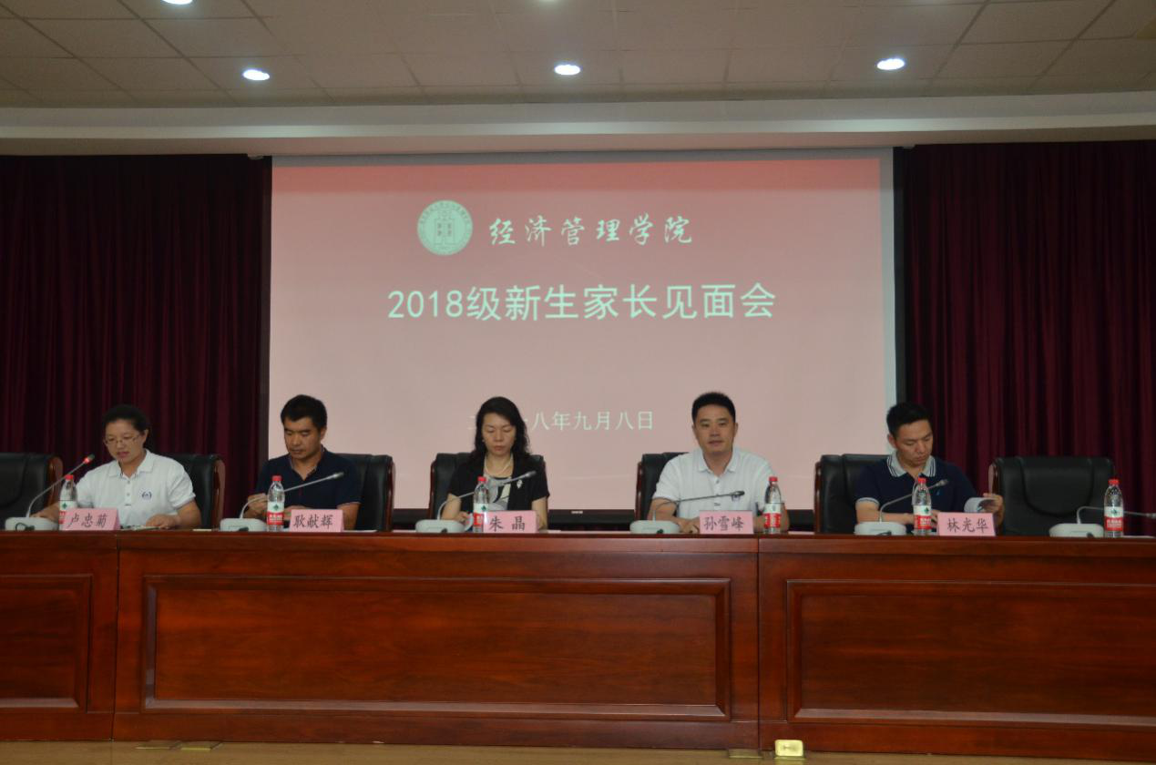 2018年9月8日下午3:00,经管院2018级新生家长见面会在金陵研究院三楼报告厅举行。白菜导航所有网站网址院长朱晶教授、院党委副书记(主持工作)孙雪峰、副院长耿献辉、副院长林光华、院党委副书记卢忠菊以及各系系主任、各新生班主任老师、本科生辅导员出席会议。会议由院党委副书记卢忠菊主持。