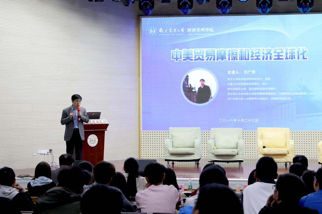 第一阶段,万广华教授作了题为“中美贸易摩擦与全球化”的专题讲座。他结合曾任职悉尼大学、联合国和亚洲开
