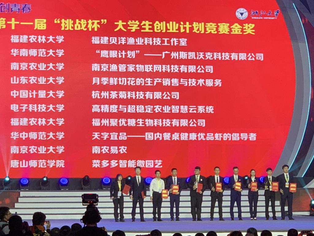 10月31日至11月3日,由共青团中央、教育部、人力资源和社会保障部、中国科协、全国学联、浙江省人民政府主办,浙江大学、共青团浙江省委承办的2018年“创青春”浙大双创杯全国大学生创业大赛在浙江大学隆重举行。经过激烈的网络评审和现场答辩等环节,我院“南京渔管家物联网科技有限公司”喜获金奖。