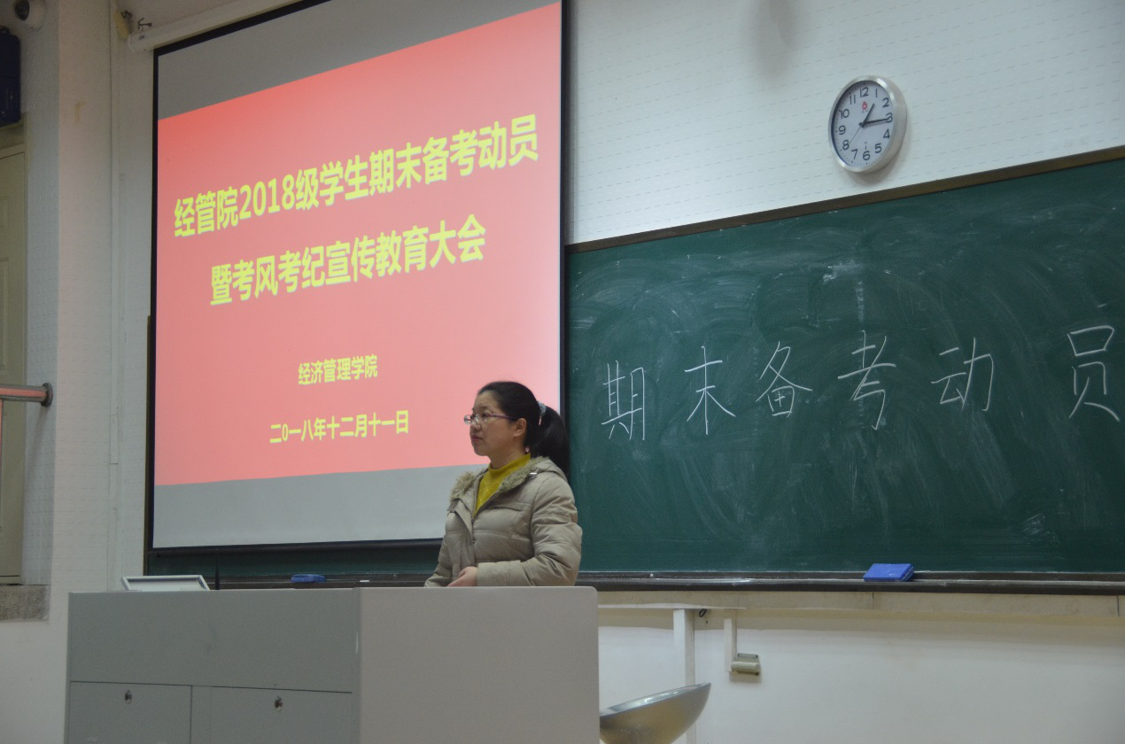 2018年12月11日,白菜导航所有网站网址2018级学生期末备考动员暨考风考纪宣传教育大会在教学楼C201举行。白菜导航所有网站网址党委副书记卢忠菊、本科生辅导员郑琼婷出席会议。白菜导航所有网站网址全体2018级本科生参加大会。
