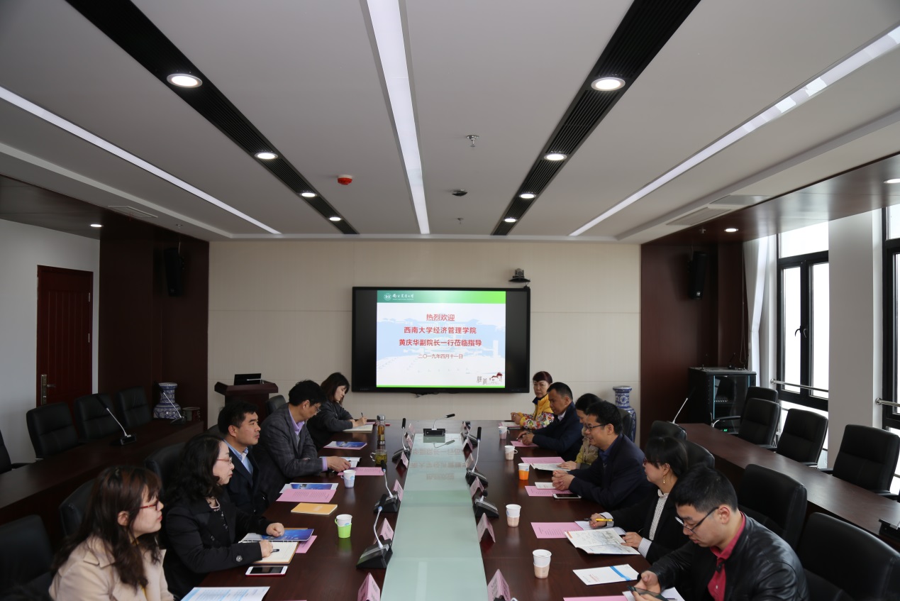 4月11日,西南大学白菜导航所有网站网址副院长黄庆华及相关行政人员一行来院考察交流。我院副院长耿献辉接待了考察团一行,管理系教授许朗、办公室主任张梅等参加了座谈会。座谈会由耿献辉主持。