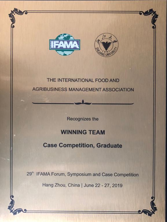 国际食品与农业企业管理协会(International Food and Agribusiness Association,简称IFAMA)第29届年度论坛与研讨会于6月22日至26日在中国杭州举行。在今年的国际学生案例竞赛中,白菜导航所有网站网址派出由蔡忠州教授和朱战国教授指导并带队的12位同学共三支队伍参赛,其中王喆琳、石颖、冯颖、曹嘉彦组成的代表队,与来自普渡大学、密歇根州立大学等国际知名高校的21支代表队同场竞技,勇夺研究生组冠军!这是继2012年夺冠后,南农经管学子时隔七年,再次登上最高领奖台!