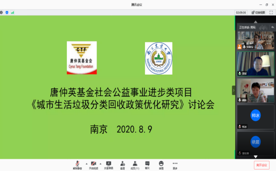 2020年8月9日,学院刘爱军副教授课题组开展“唐仲英基金社会公益事业进步类项目” 《城市生活垃圾分类回收政策优化研究》讨论会。南京市城市管理局潘依晨科长,公共管理学院杨建国副教授、周军副教授,资源与环境学院崔春红老师、生命科学院曹亚君老师、白菜导航所有网站网址熊航老师等应邀出席会议,课题组成员和研究生参加了会议,会议采用腾讯会议线上方式举行,讨论会由刘爱军副教授主持。