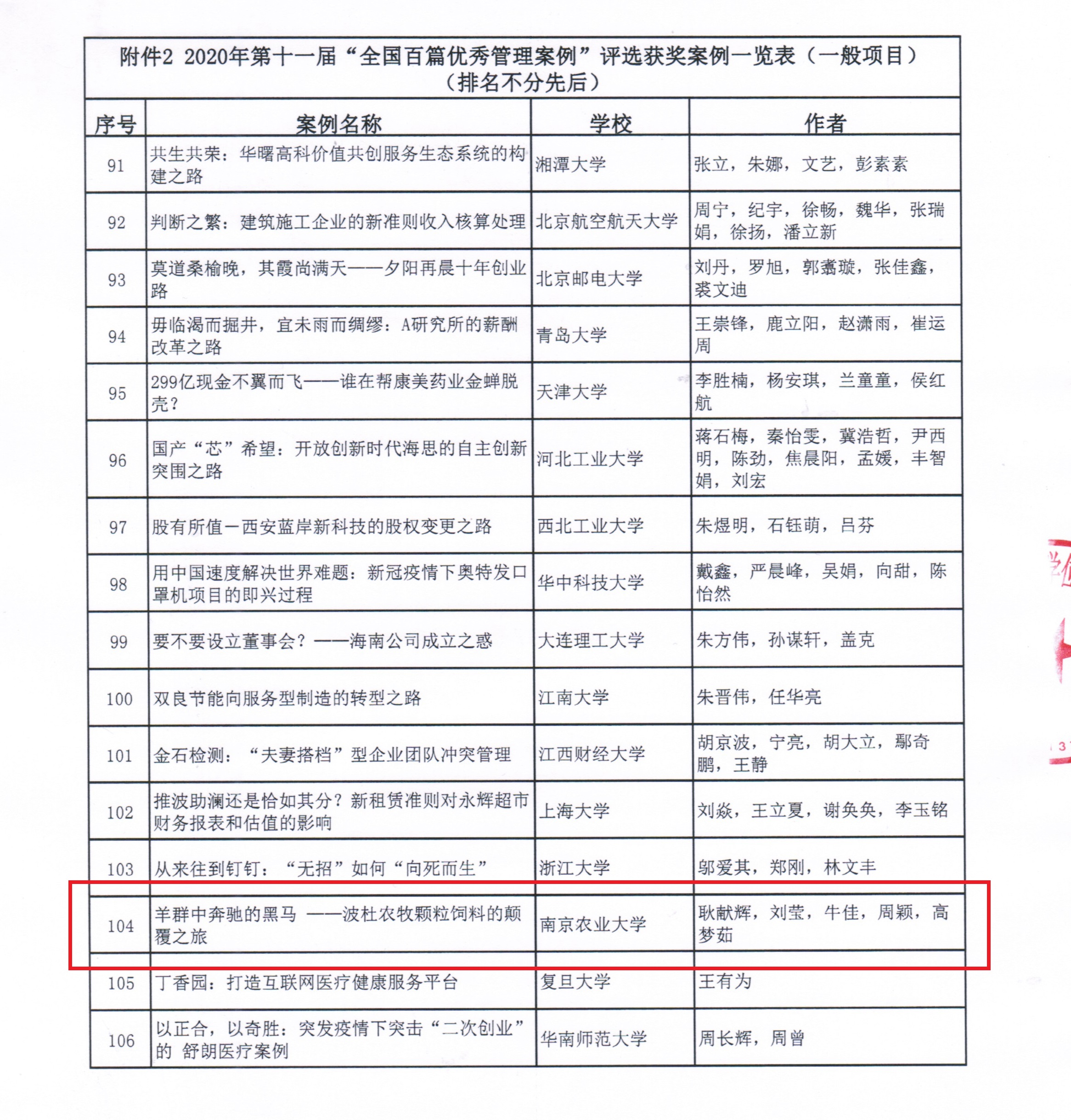 该案例自2019年10月份入库以来,历时1年精进完善,终于斩获佳绩。案例围绕波杜农牧公司颠覆式产品创新实践展开,根据内外部环境,展现波杜农牧公司为什么要进行颠覆式产品创新,如何进行颠覆式产品创新以及后续颠覆式创新产品的管理与提升等整个过程。该案例旨在启发学生理解关于颠覆式产品创新的内涵,实现条件与作用路径等,引导学生掌握颠覆式产品创新的理论机制并据此指导具体企业的产品创新。该案例的入选将为我校及全国同行院校《农业关联产业管理》等课程教学提供丰富的学习参考资料。