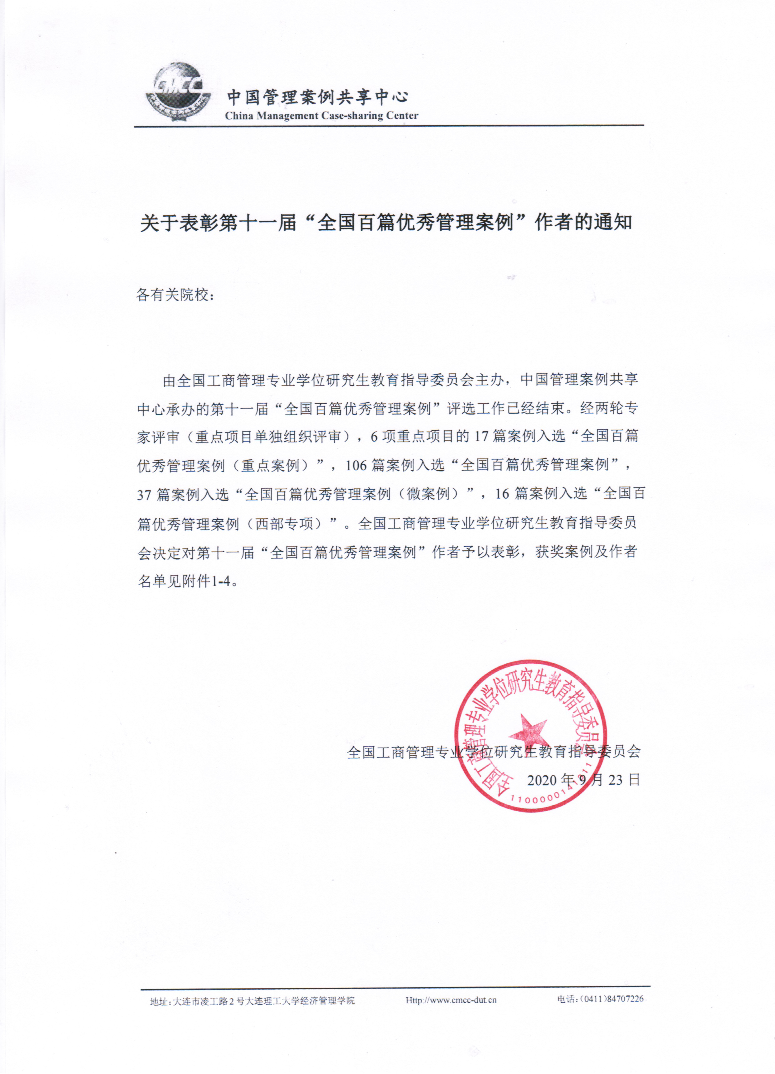 9月23日,由全国工商管理专业学位研究生教育指导委员会主办,中国管理案例共享中心承办的第十一届“全国百篇优秀管理案例”评选工作已经结束,我院开发的MBA案例获评第十一届“全国百篇优秀管理案例” 。