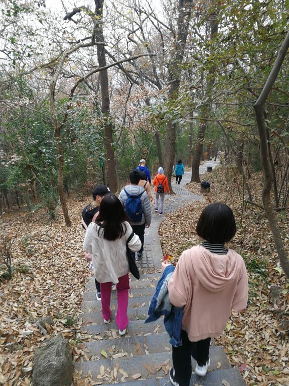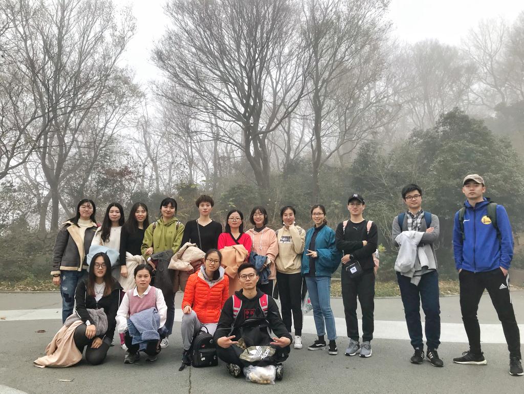 在登山过程中也发生了一些有趣的事情,由于今天的雾气十分重,所以我们戏称我们得道升仙了,每个人都有种腾云驾雾的感觉;半山腰的时候我们跟东南大学研二的学生相互拍照留念,最后我们又在山顶相遇;在路上听着别人说登山辛苦,要把所有密码告诉舍友的调侃;看着六七十岁老爷爷光着上身上山下山;虽然有一个同学因为没吃早饭而不舒服,但是最后还是在调整补给之后登上了山顶。